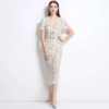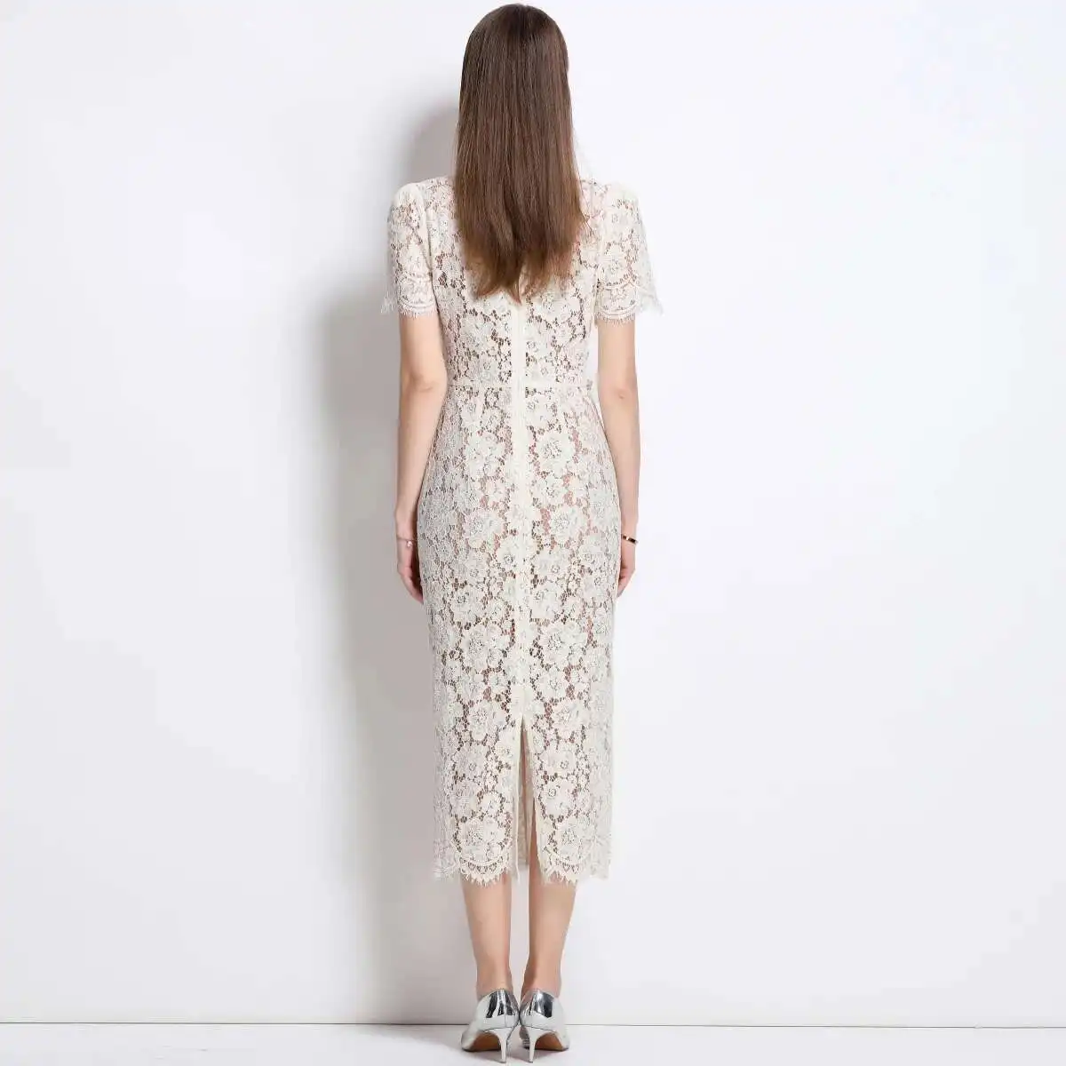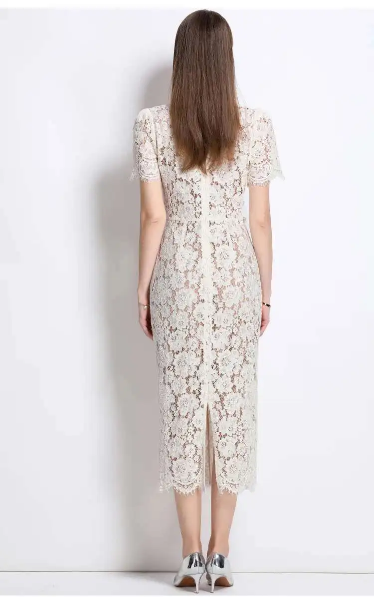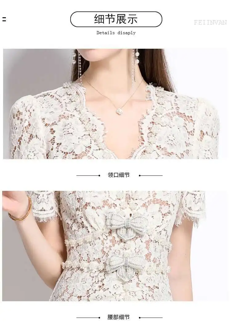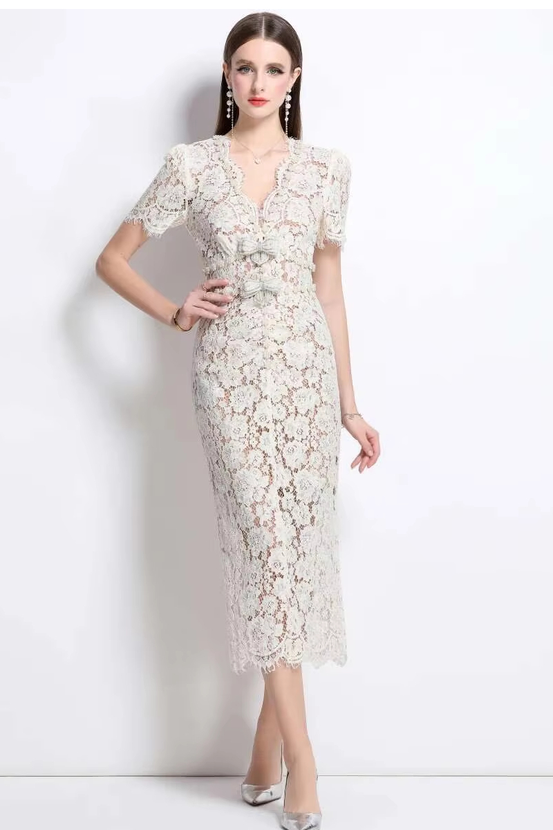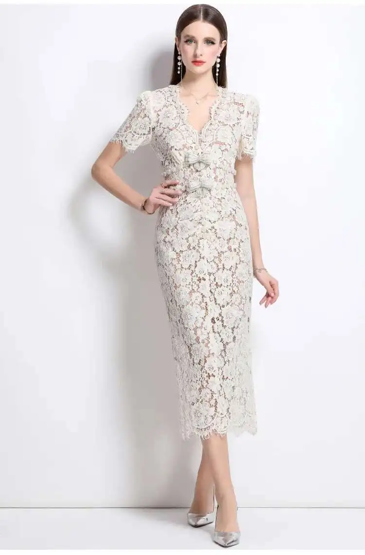 Victoria’s Vogue Crystal Bow Evening Formal Dress Women Summer Elegant Short Sleeve Hollow Out Pearl Embroidery Midi Long Lace Dresses