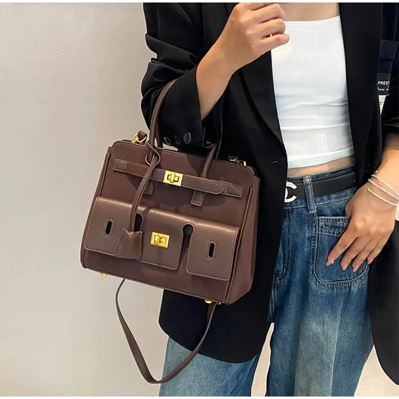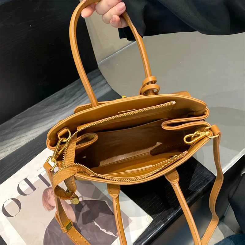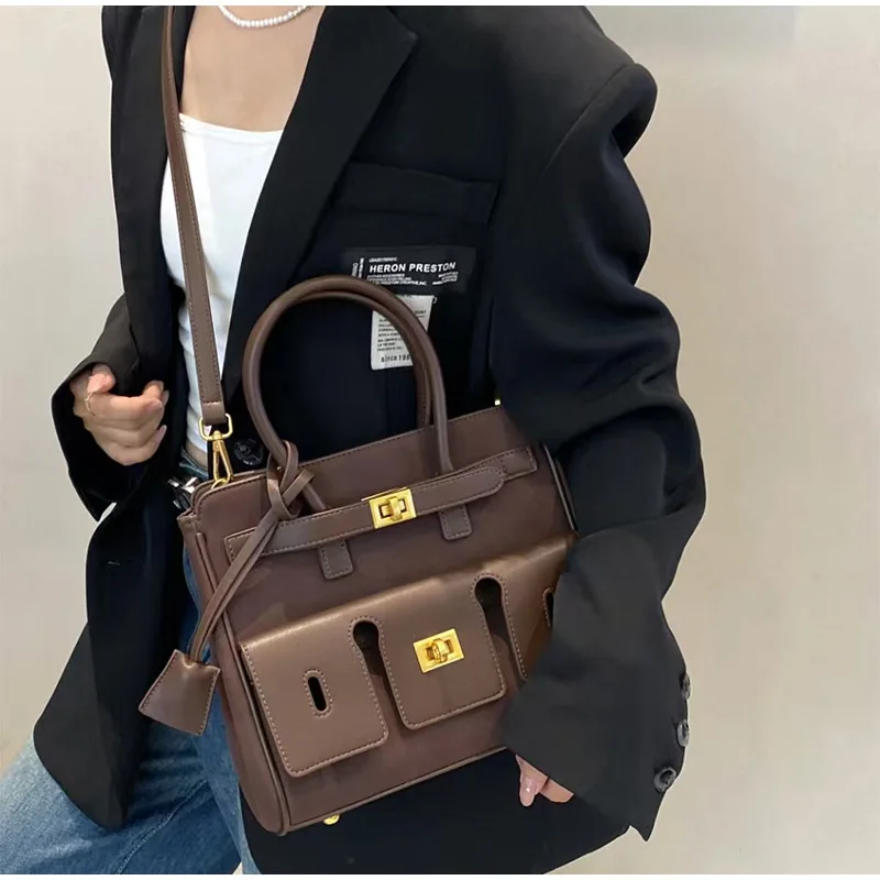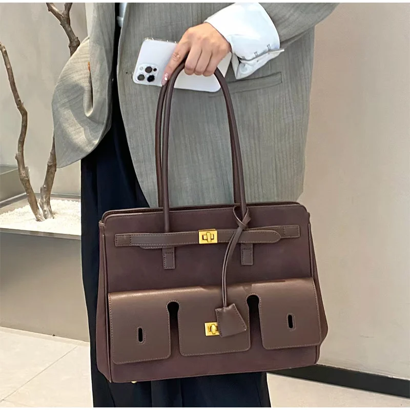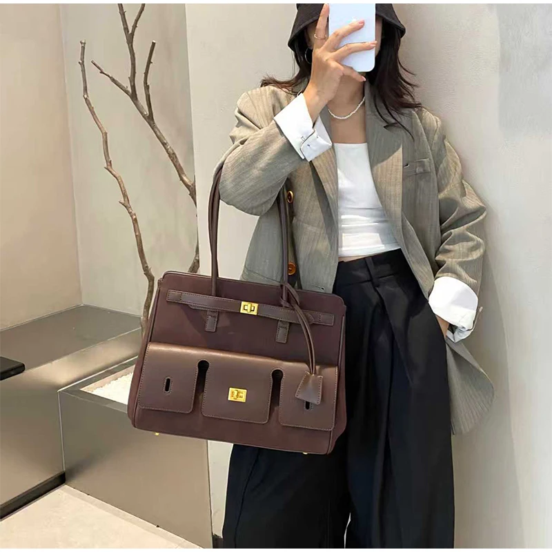 Victoria’s Vogue Luxury Genuine Leather Women’s Shoulder Bag Cowhide Large Capacity Designer Handbag Commuter Shopping Bag Lock Tote Bag Wing Bag