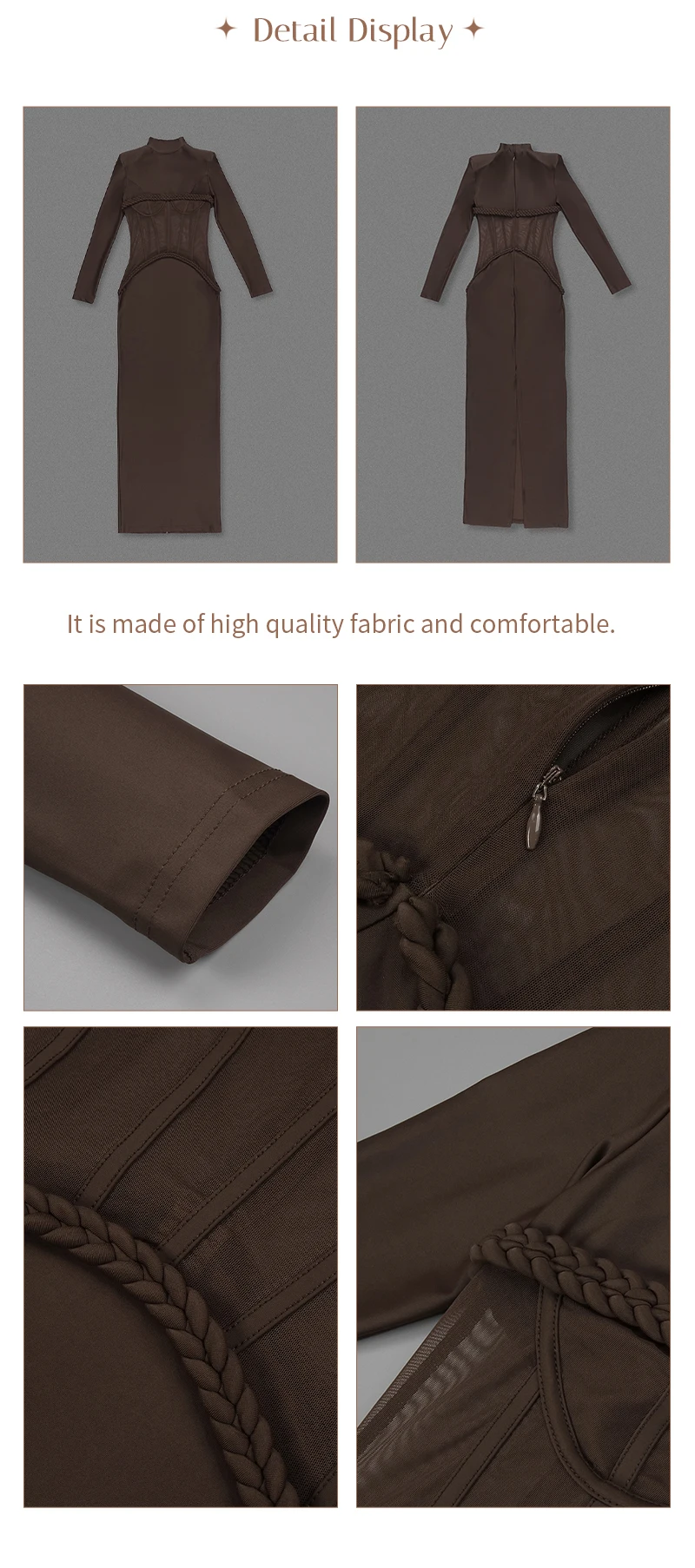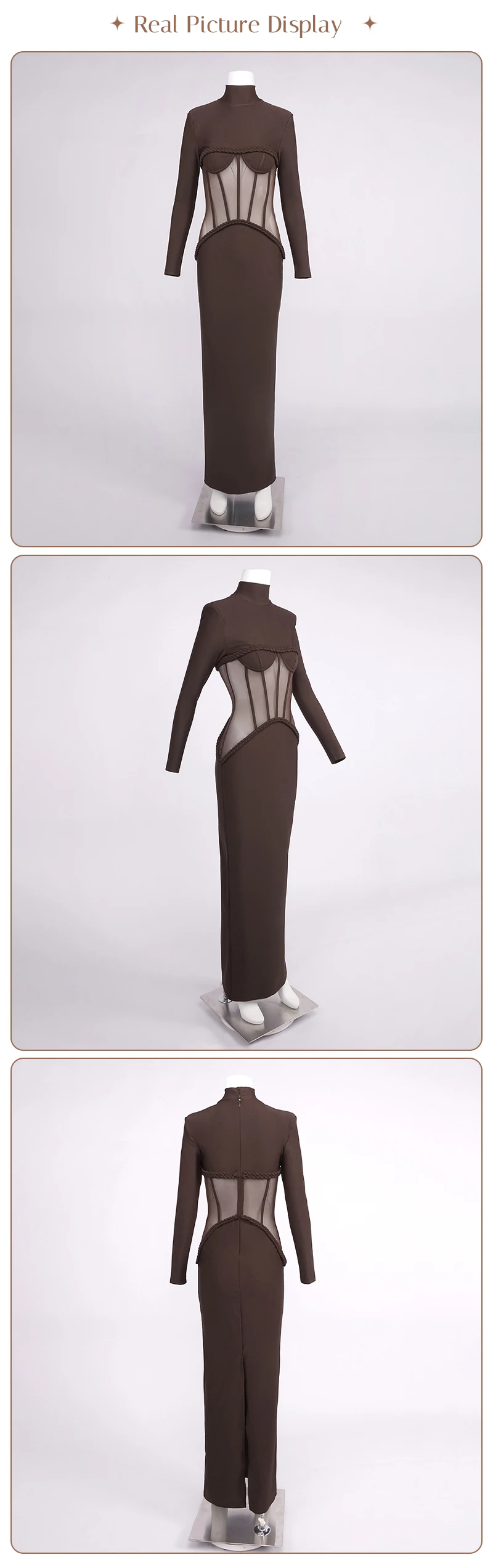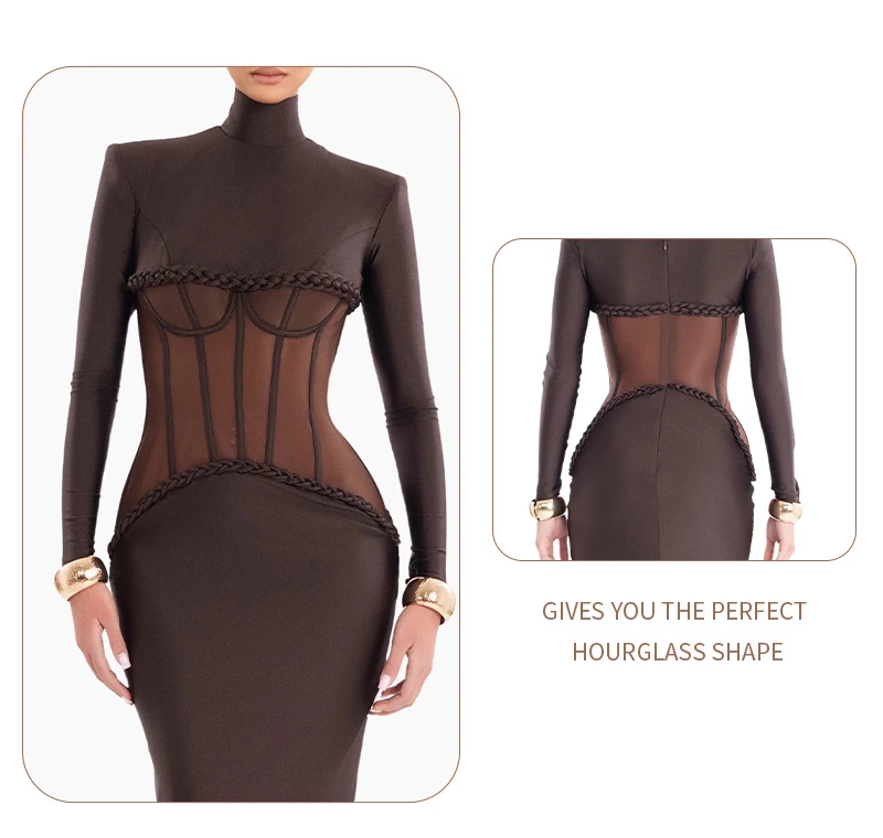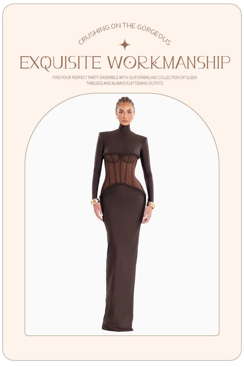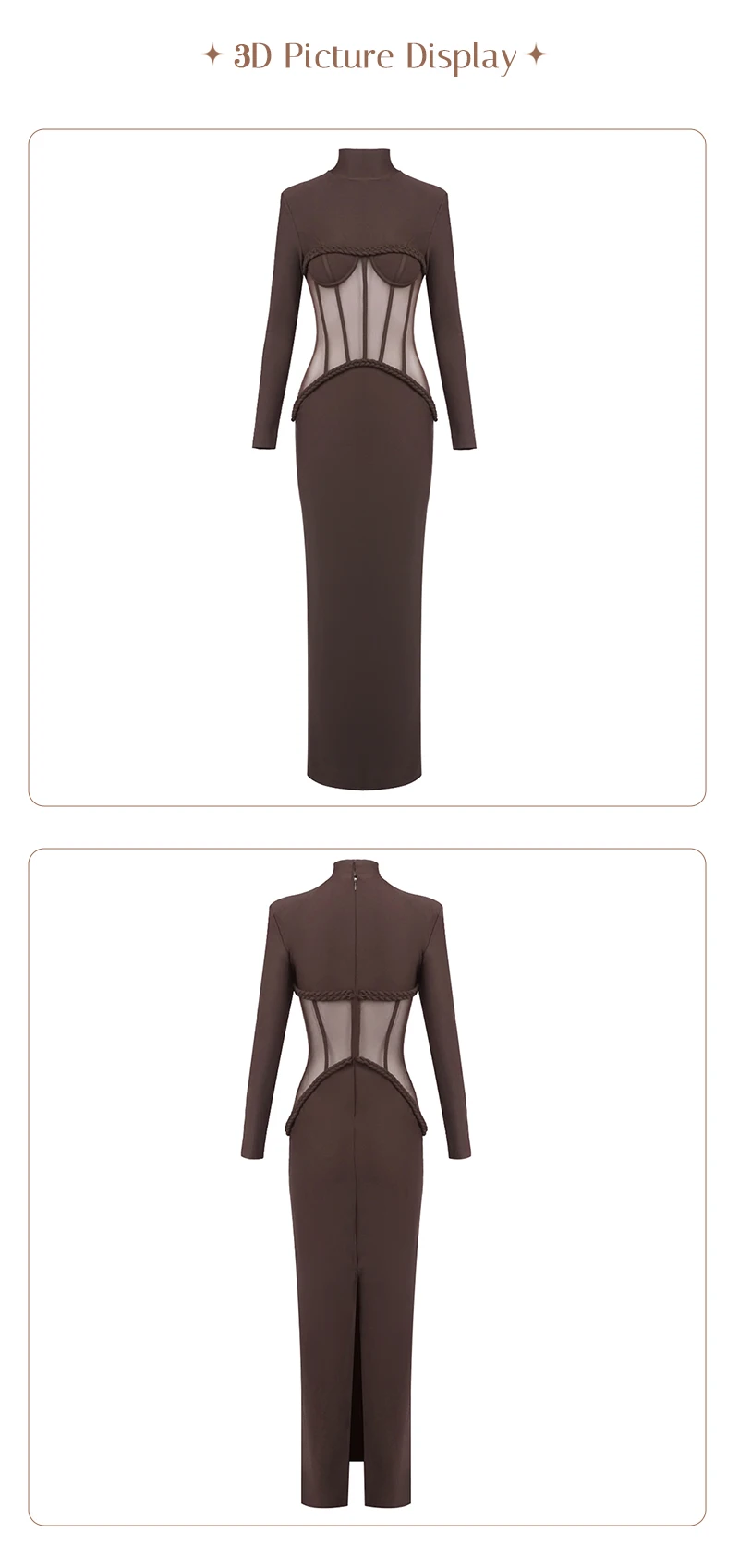 Luxury Sheer Corset Brown Long Dresses for Women – Long Sleeve High Neck See Through Bodycon Maxi Dress with Mesh Waist Detail