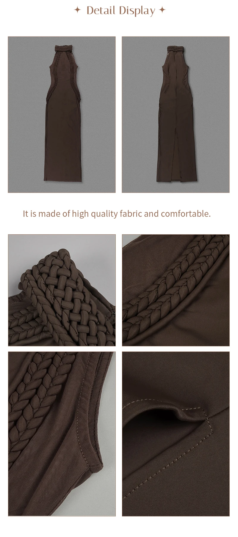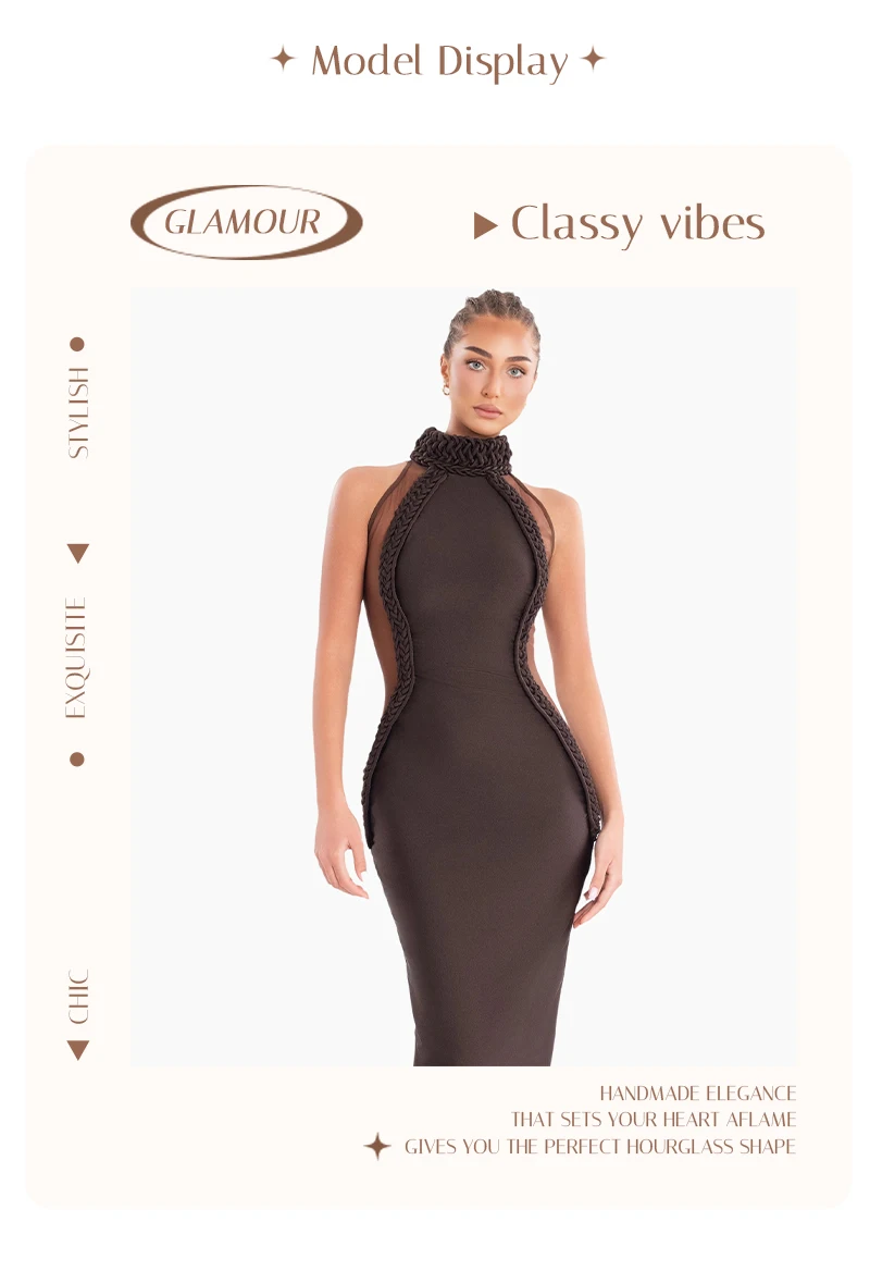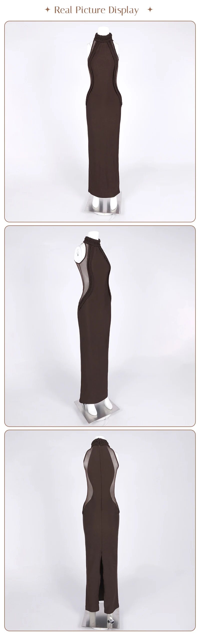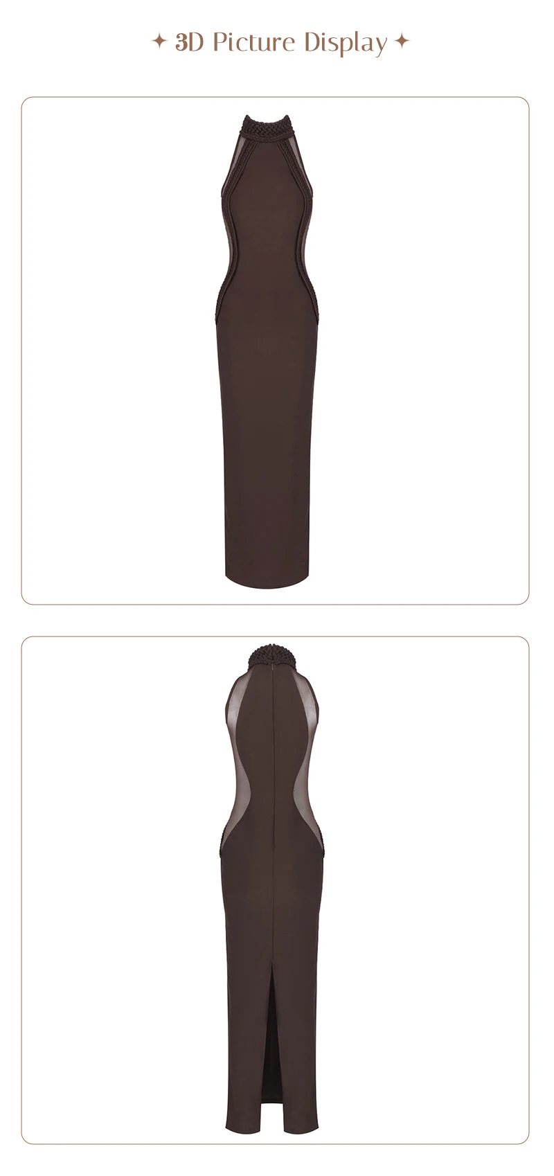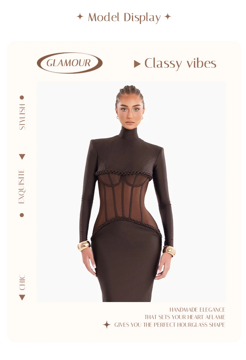 Luxury Sheer Corset Brown Long Dresses for Women – Long Sleeve High Neck See Through Bodycon Maxi Dress with Mesh Waist Detail