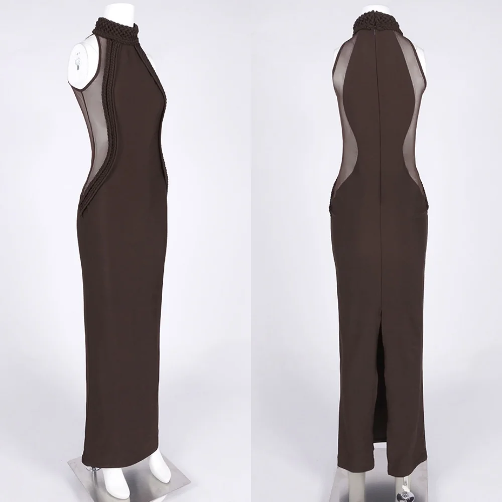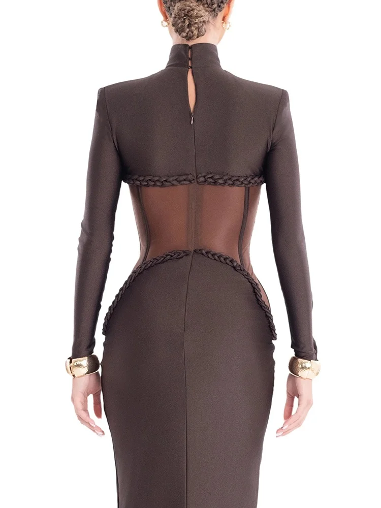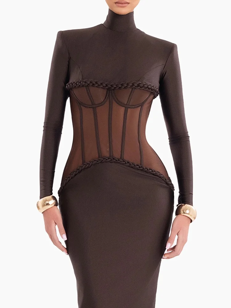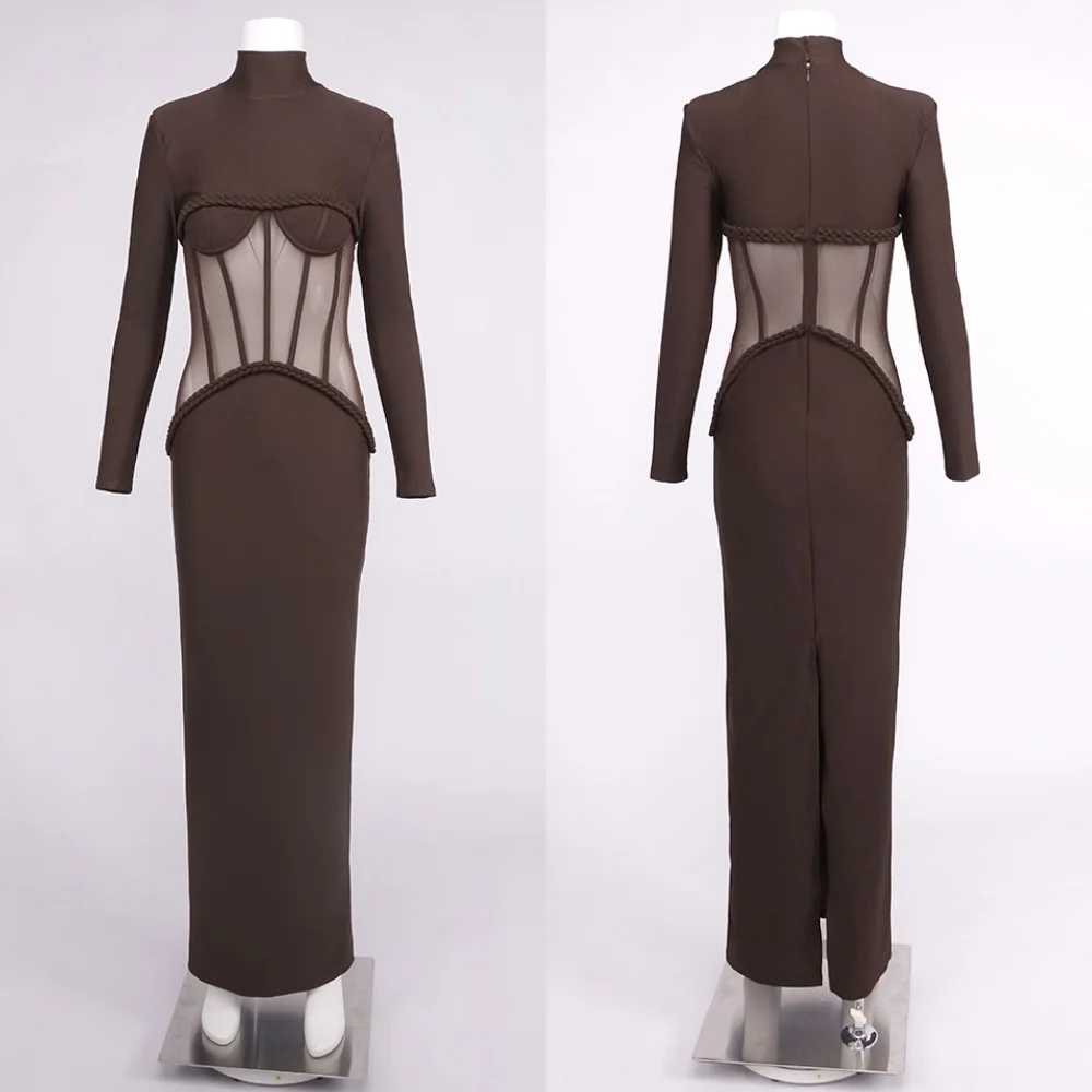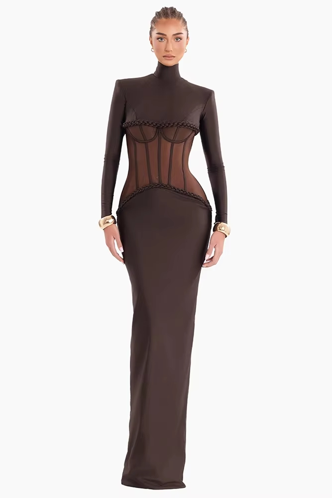 Luxury Sheer Corset Brown Long Dresses for Women – Long Sleeve High Neck See Through Bodycon Maxi Dress with Mesh Waist Detail