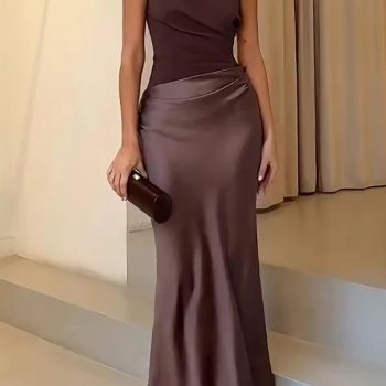 Victoria’s Vogue Satin Inclined Shoulder Sexy Maxi Dress Women Fashion Patchwork Sleeveless Backless Bodycon Evening Club Party Dress