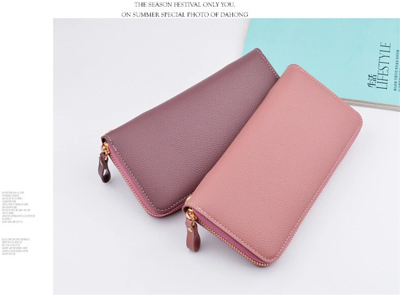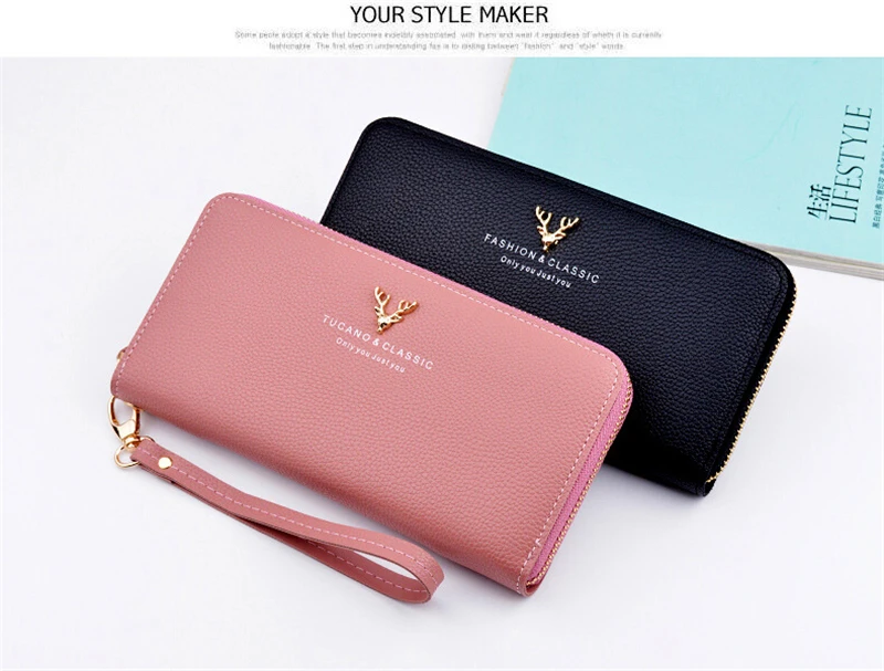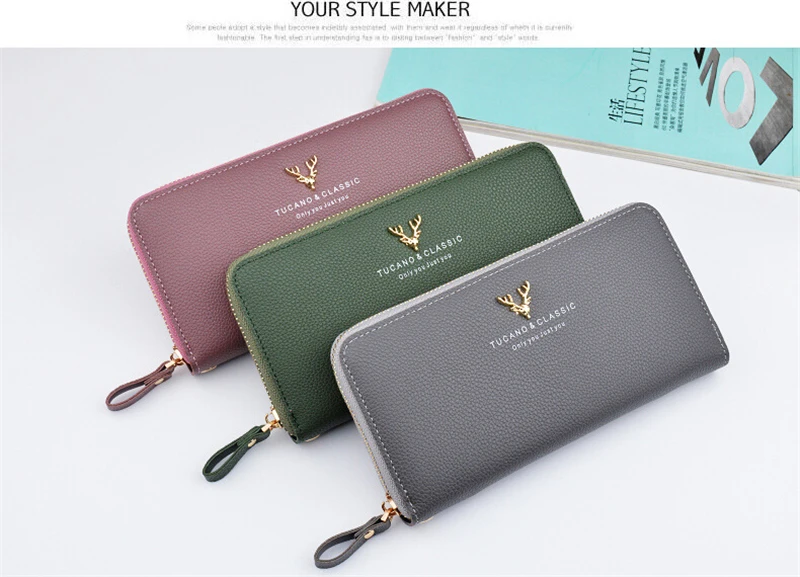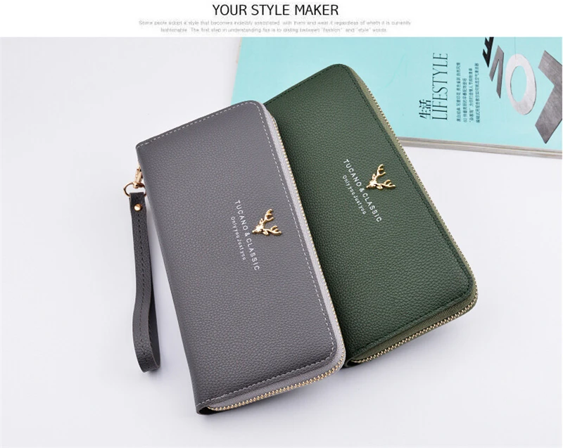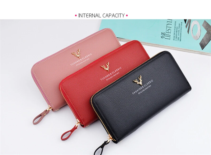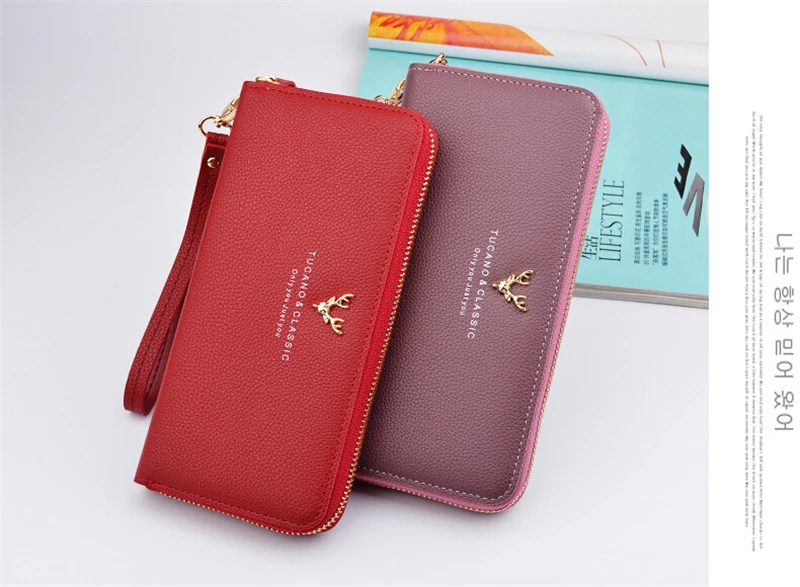 victoria’svogue Metal Deer Head Decoration Long Zippered Large Capacity Clutch Bag Stylish Women’s PU Leather Purse