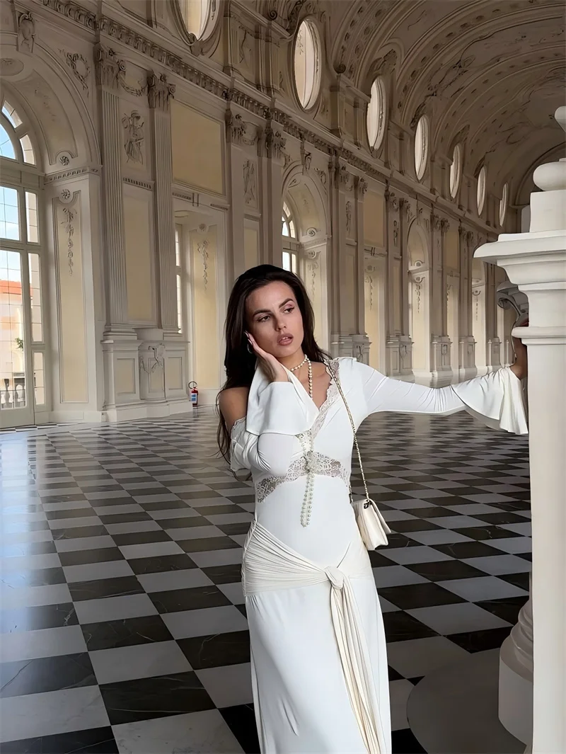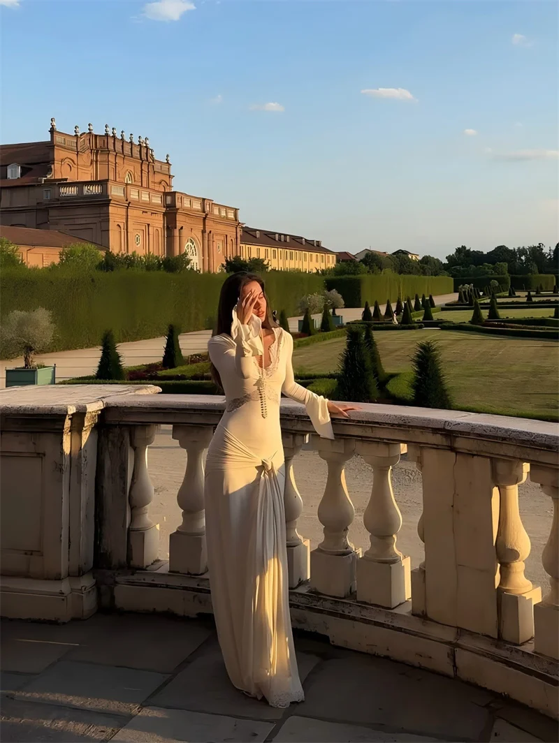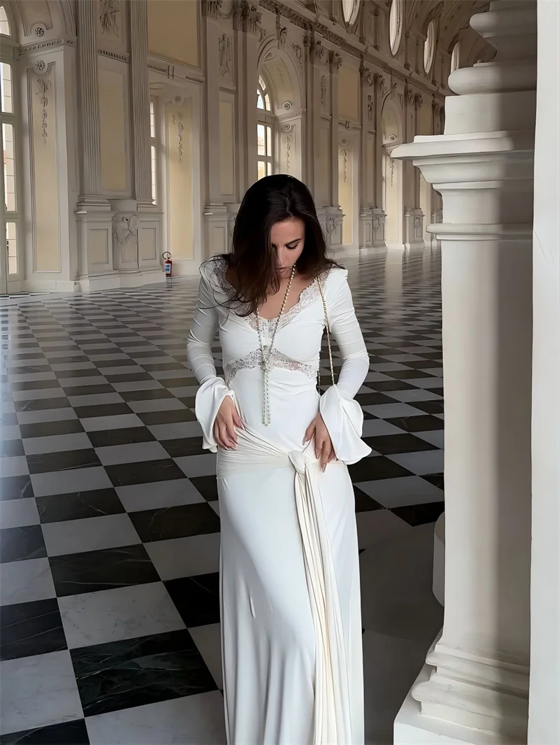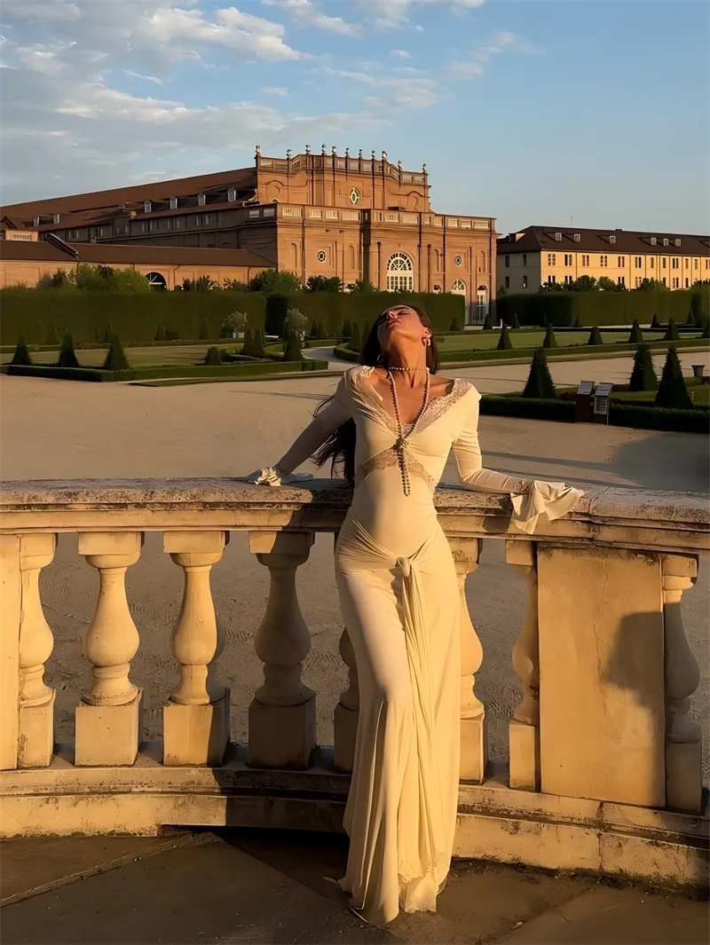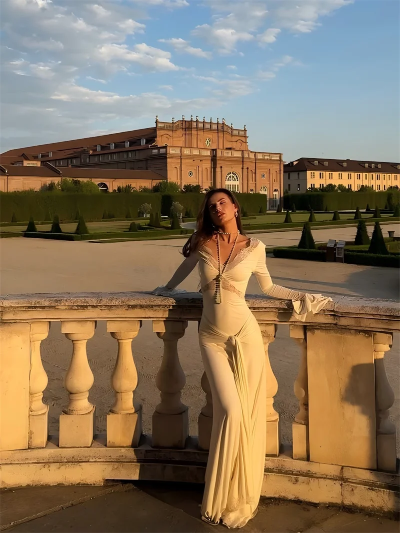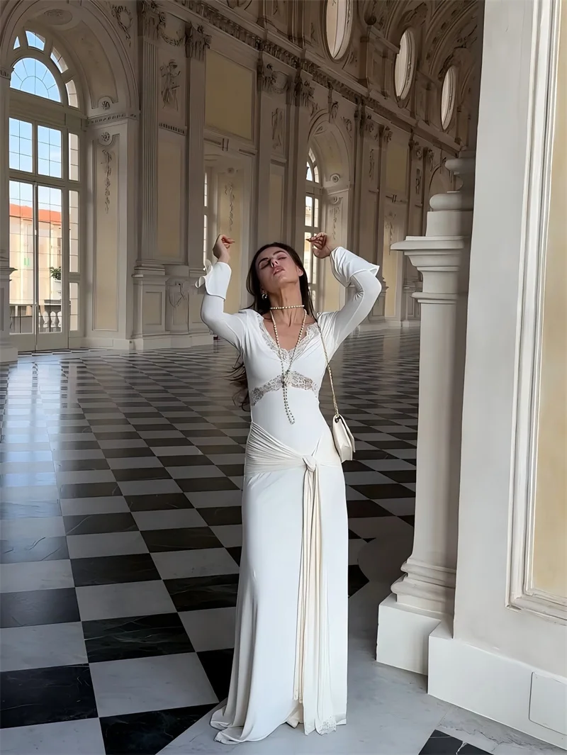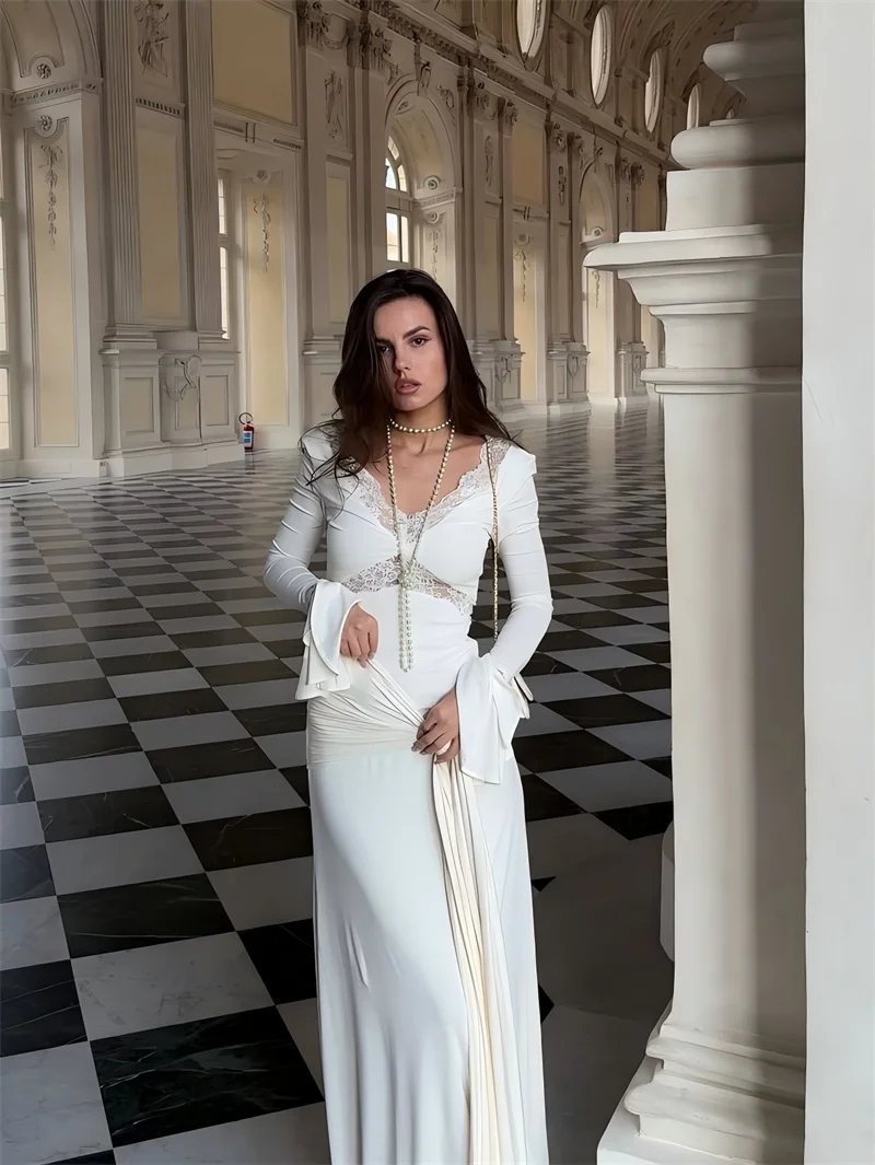 Victoria’s Vogue Autumn Long Sleeve Sexy Maxi Dress For Women Fashion Lace Patchwork V Neck Backless Draped Ruched Club Party Long Dress