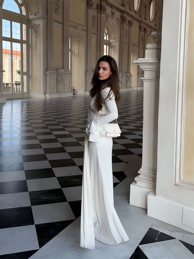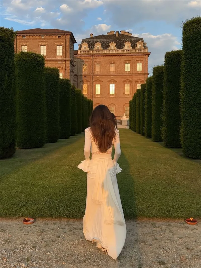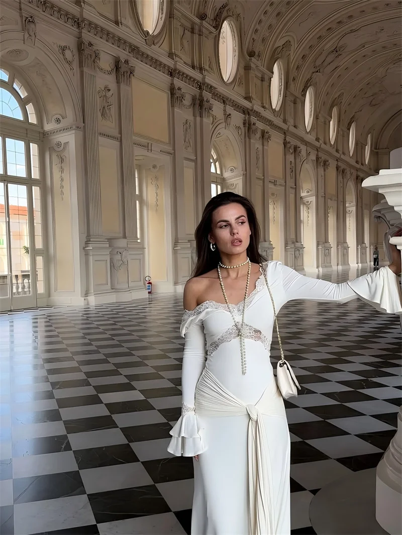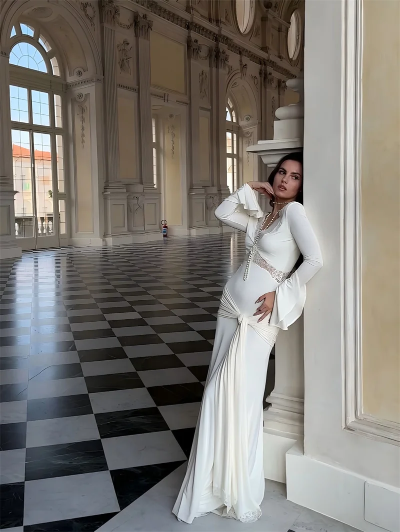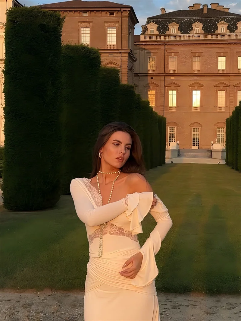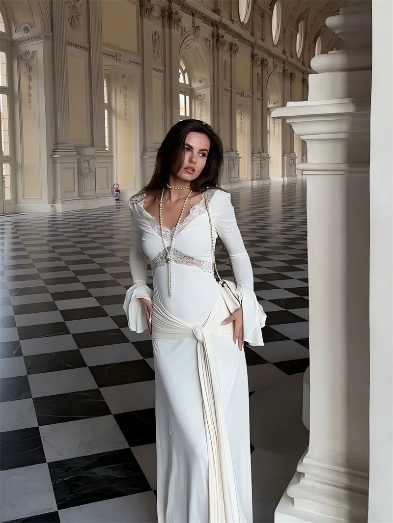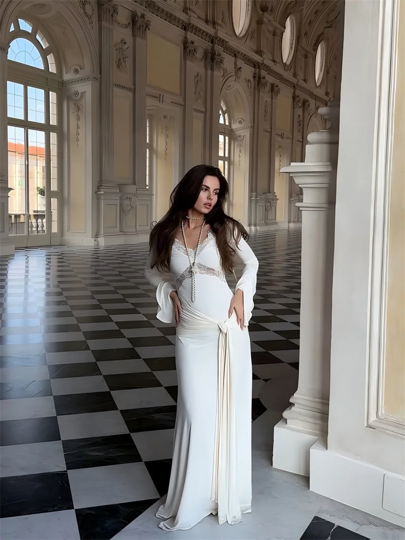 Victoria’s Vogue Autumn Long Sleeve Sexy Maxi Dress For Women Fashion Lace Patchwork V Neck Backless Draped Ruched Club Party Long Dress
