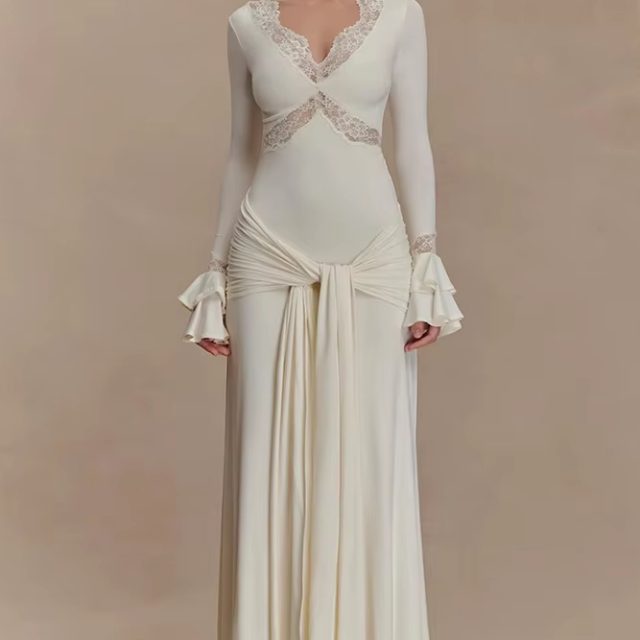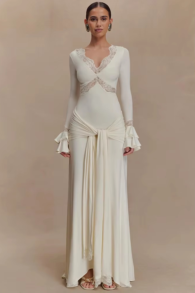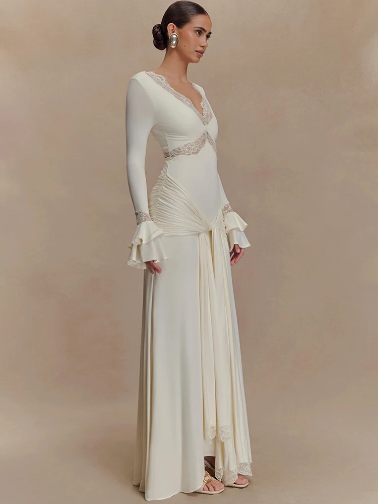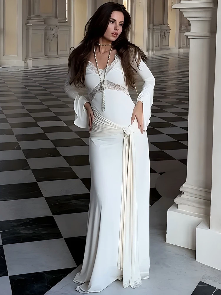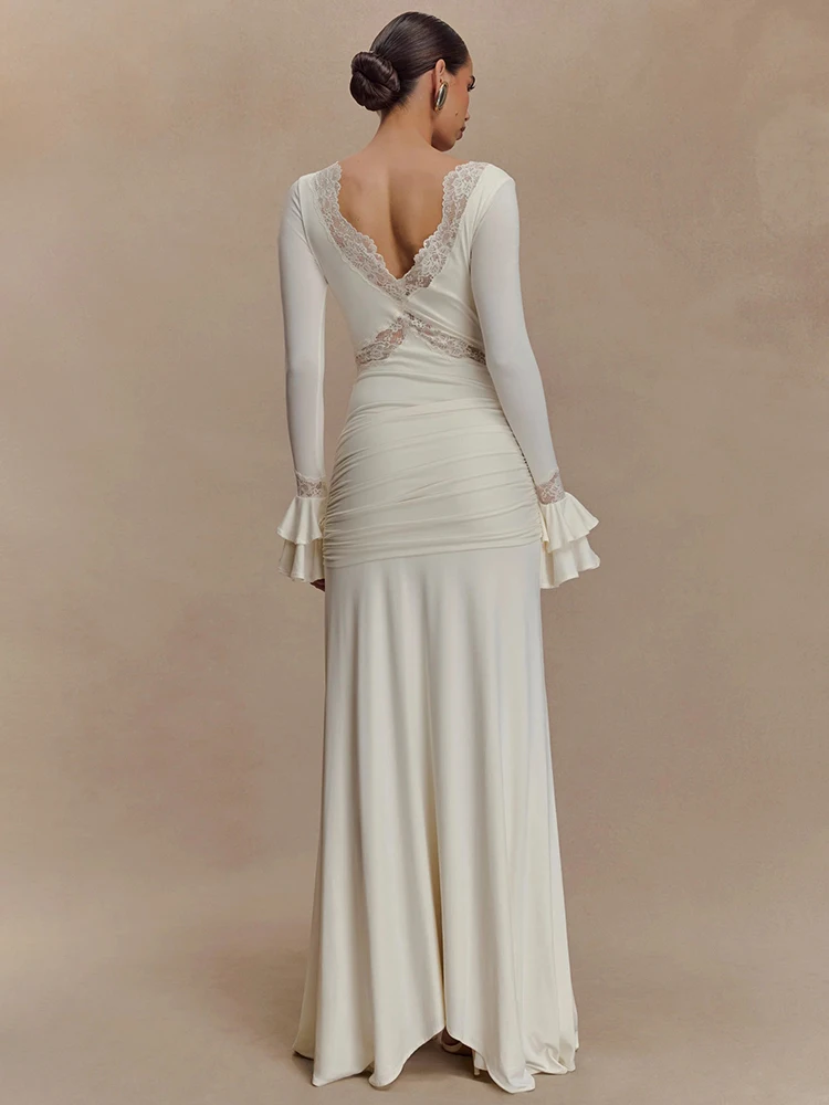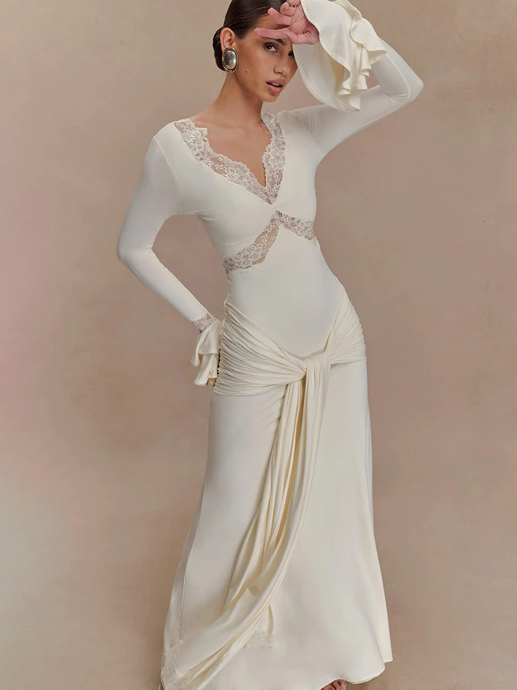 Victoria’s Vogue Autumn Long Sleeve Sexy Maxi Dress For Women Fashion Lace Patchwork V Neck Backless Draped Ruched Club Party Long Dress