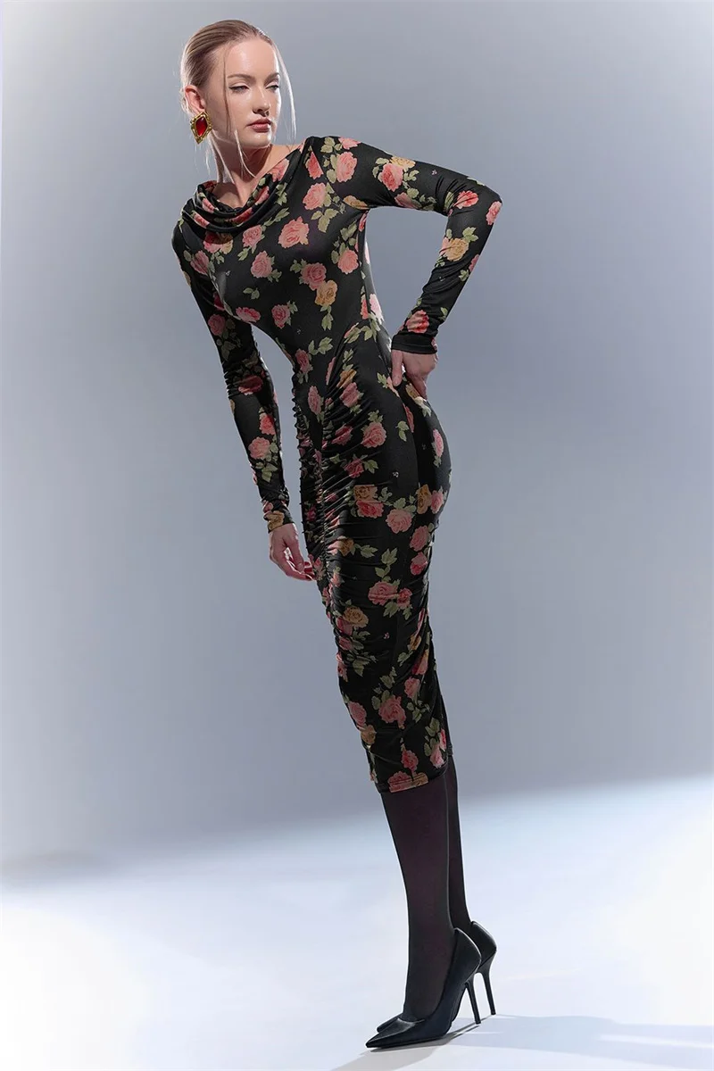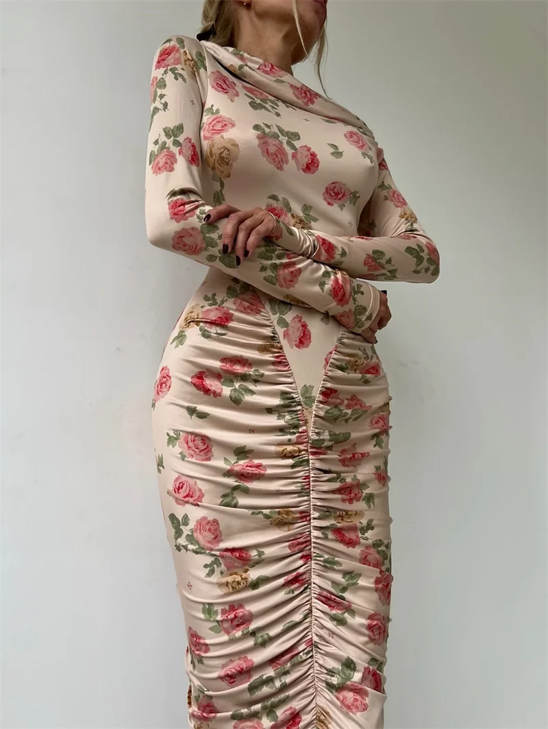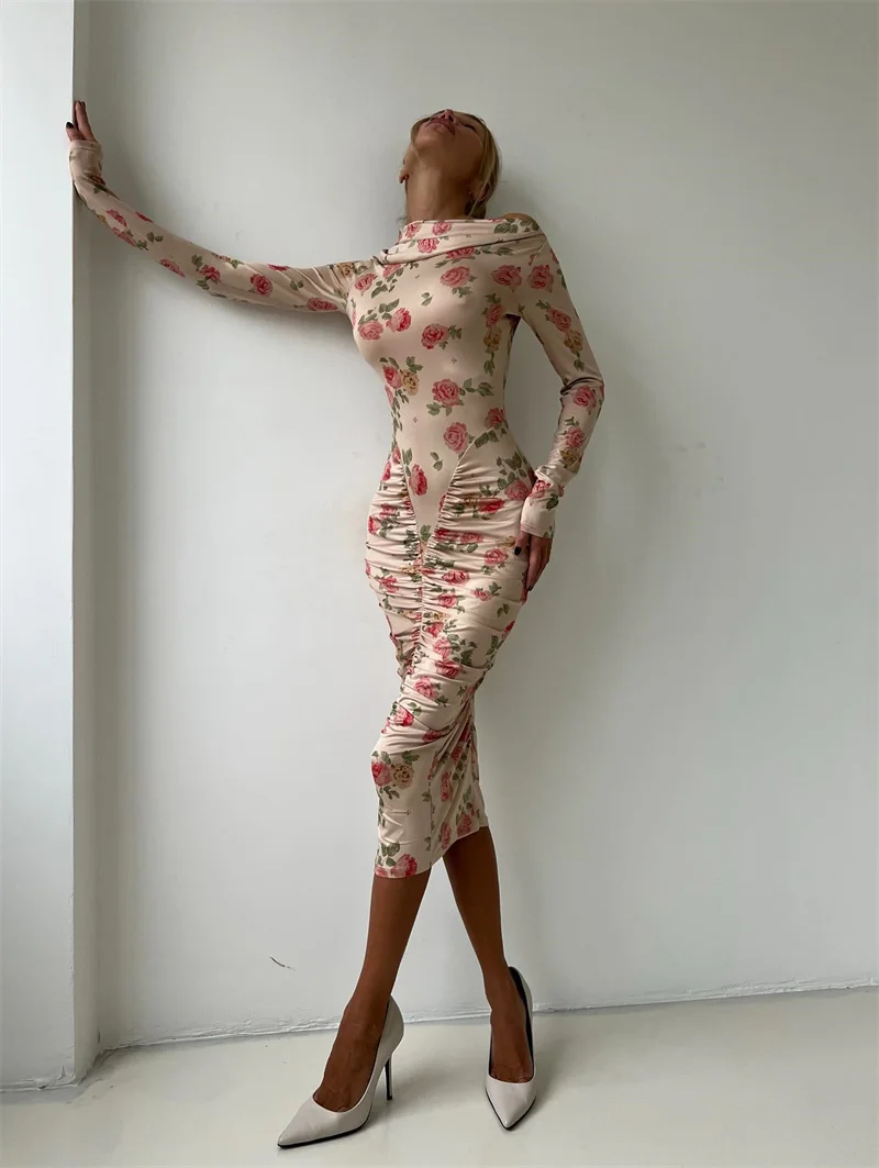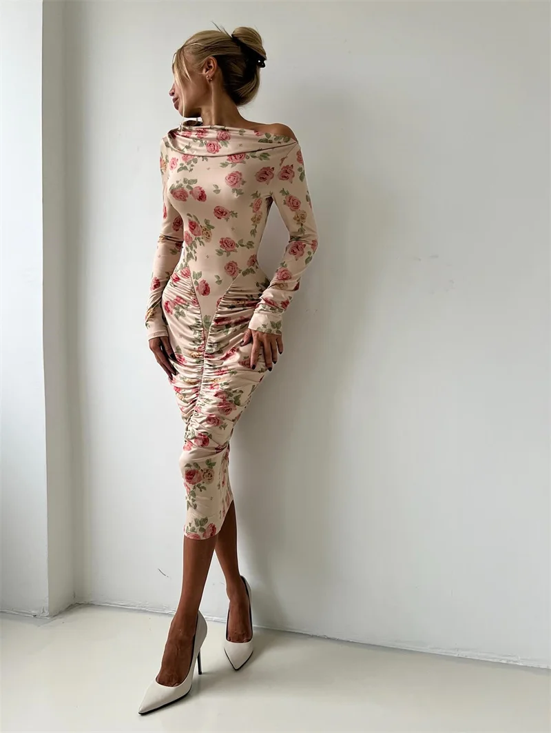 Victoria’s Vogue Diagonal Collar Long Sleeve Sexy Midi Dress Women Gown Elegant Backless Ruched Bodycon Club Party Long Dresses Female