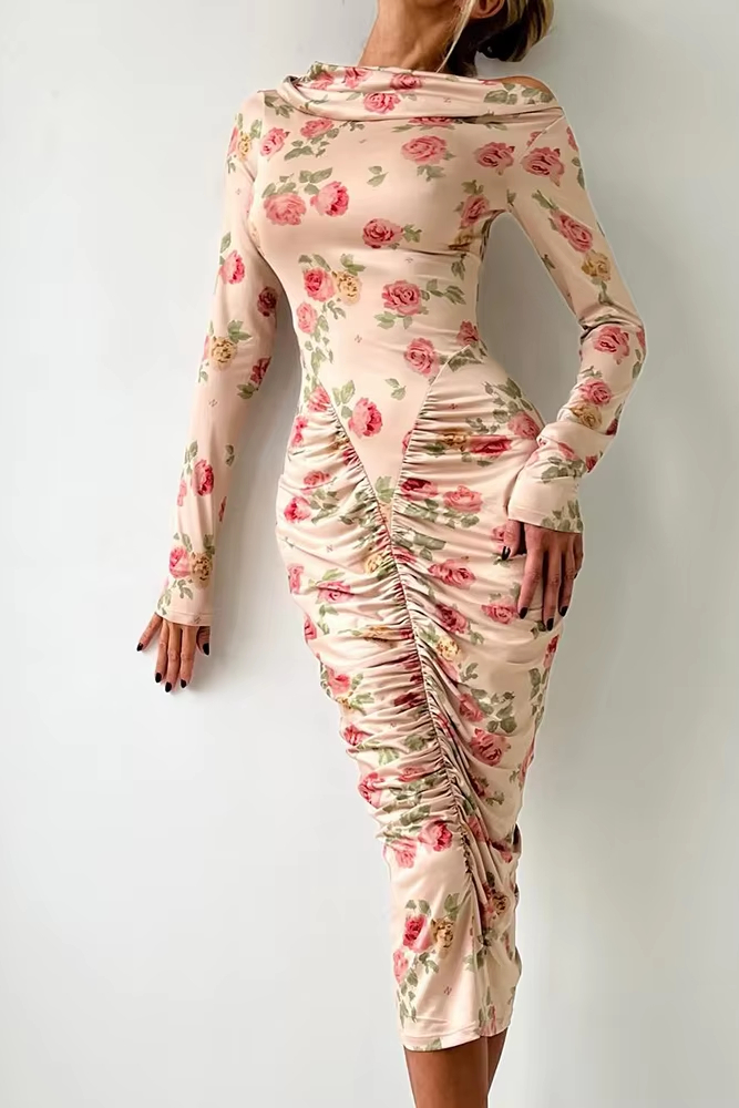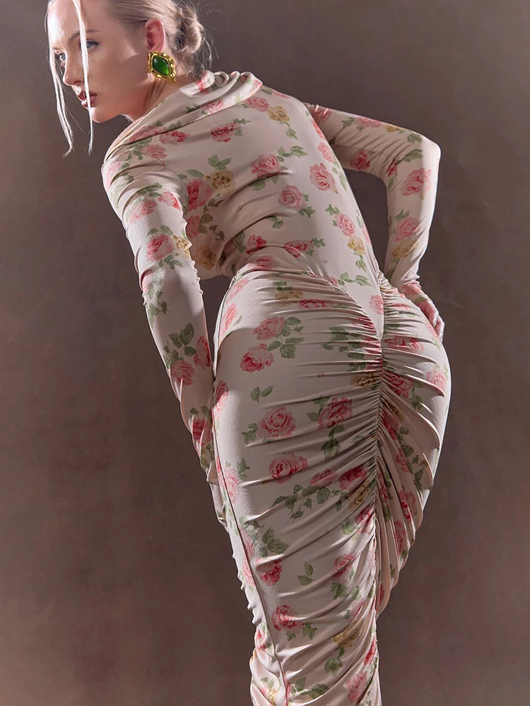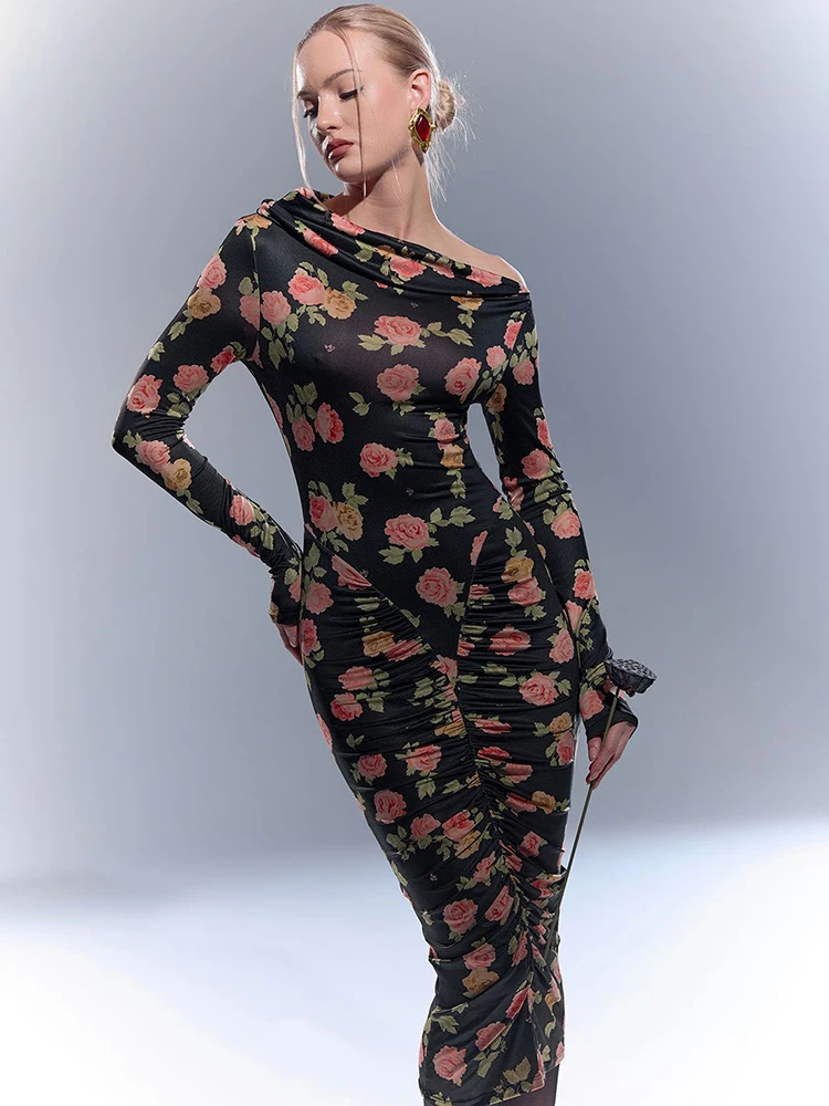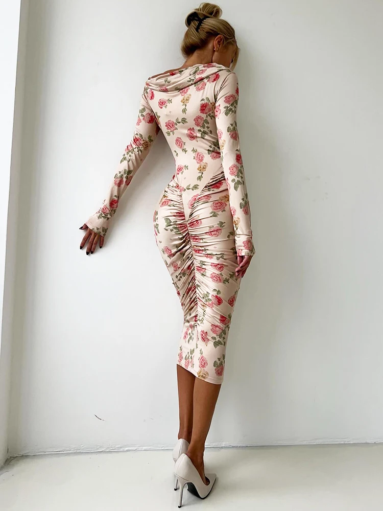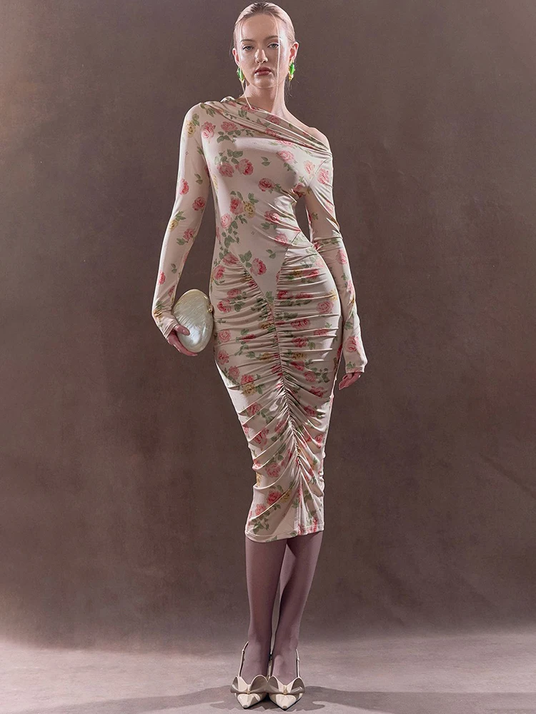 Victoria’s Vogue Diagonal Collar Long Sleeve Sexy Midi Dress Women Gown Elegant Backless Ruched Bodycon Club Party Long Dresses Female