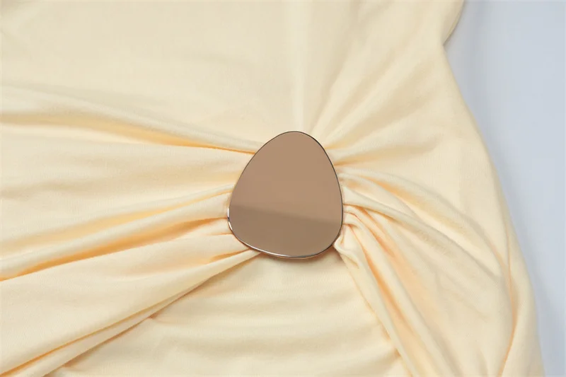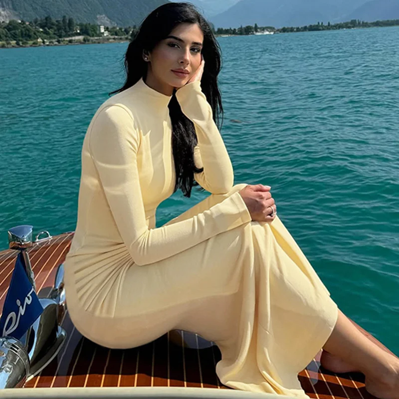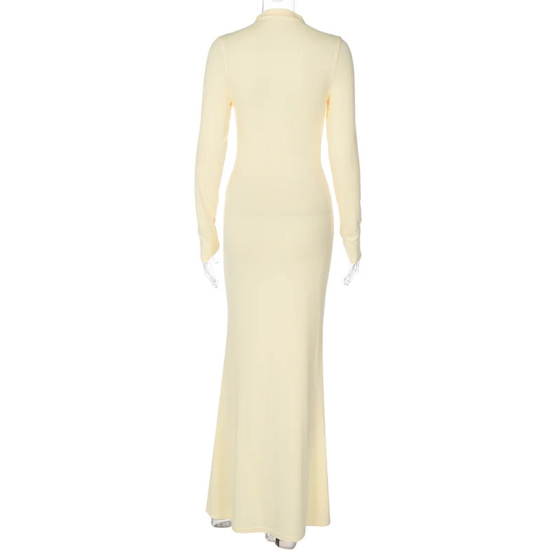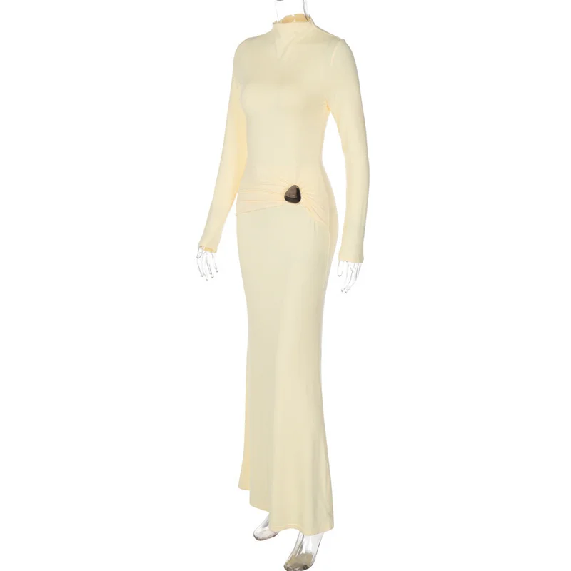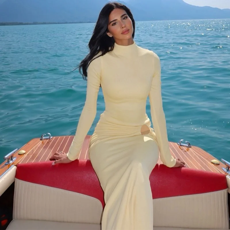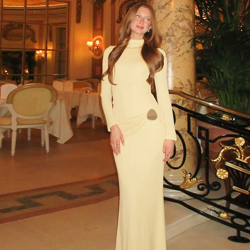 Victoria’s Vogue Half High Collar Long Sleeve Sexy Maxi Dress Women Yellow Metal Decoration High Waist Ruched Bodycon Club Long Dresses