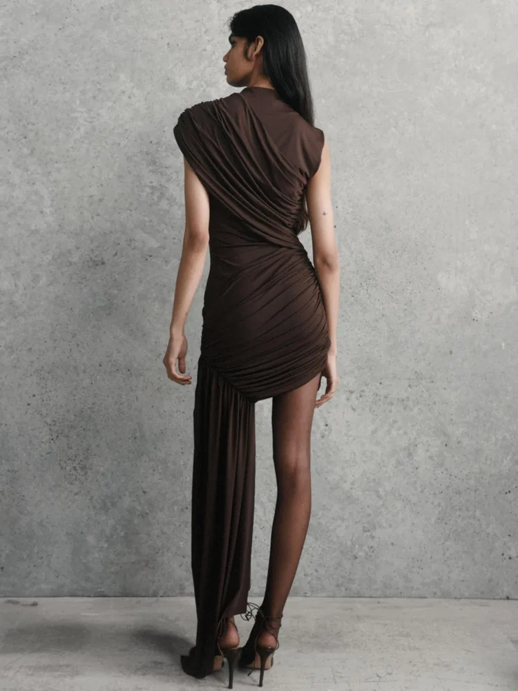 Victoria’s Vogue Irregular Draped Ruched Sexy Mini Dress For Women Elegant Turtleneck Sleeveless High Waist Pleated Club Party Dress