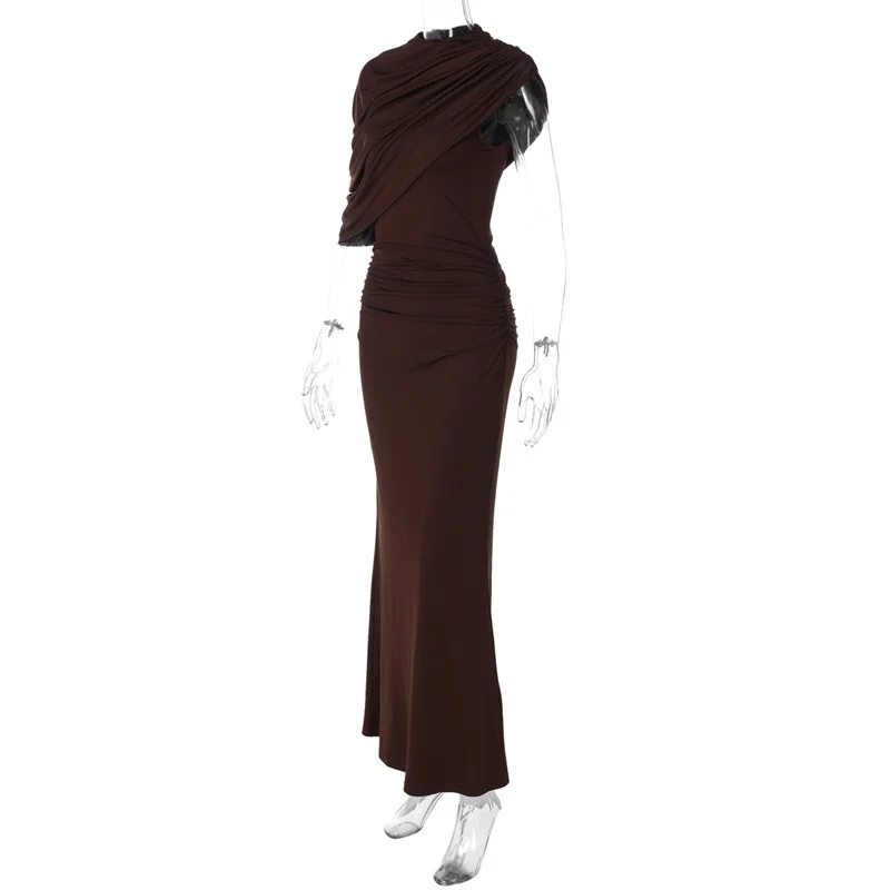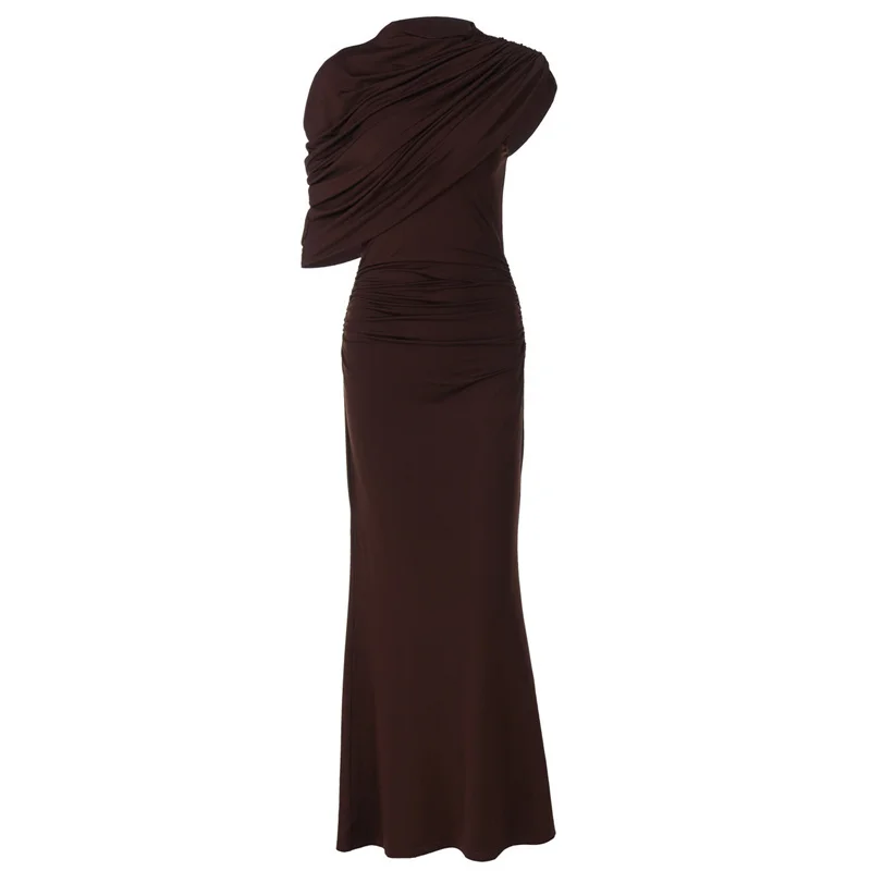 Victoria’s Vogue Irregular Ruched Sexy Maxi Dress For Women Elegant Autumn Inclined Shoulder Pleated Club Party Long Dresses Female