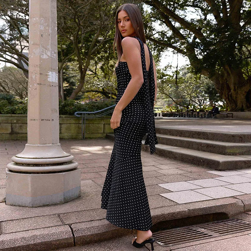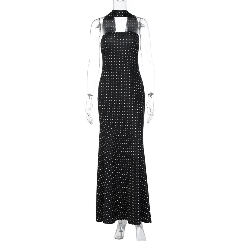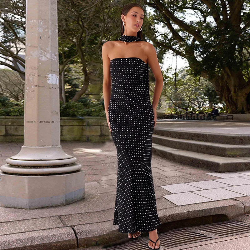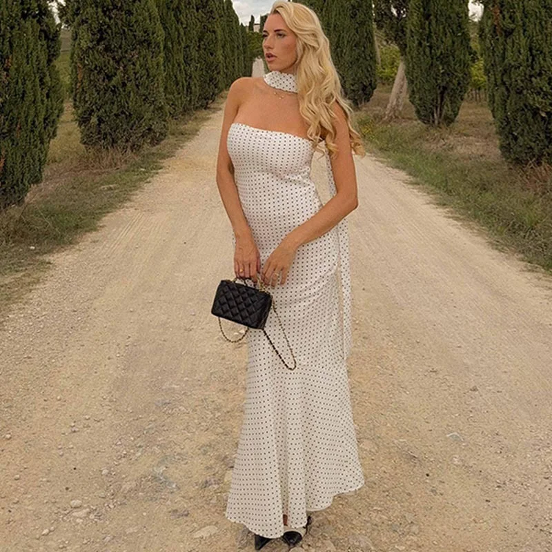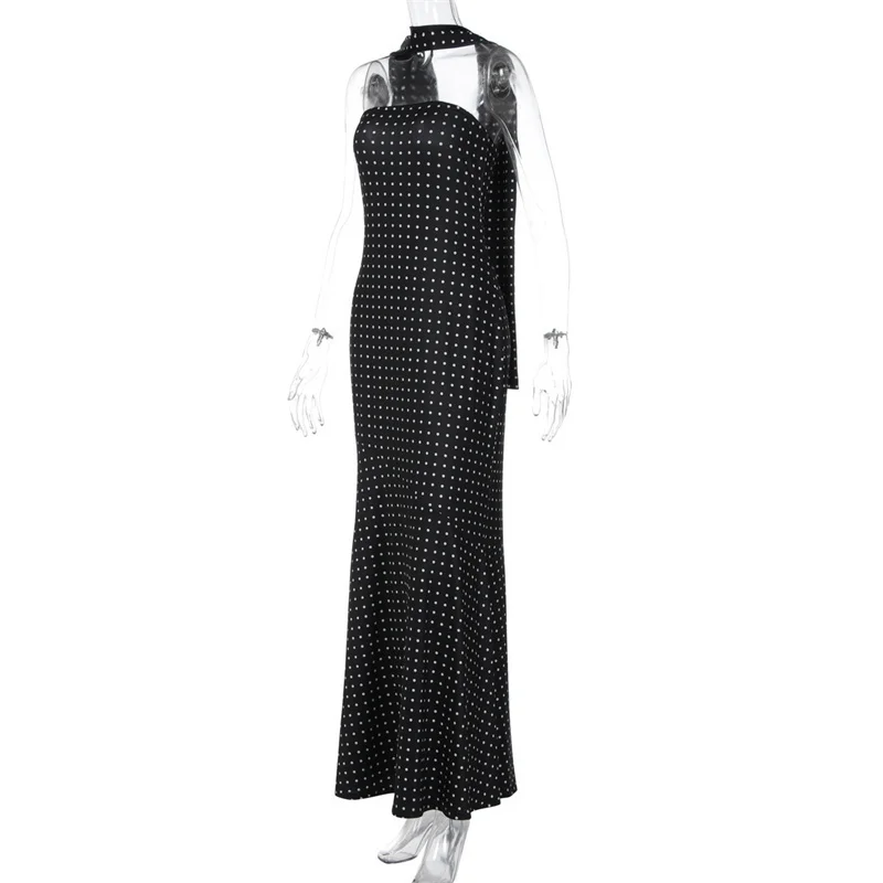 Victoria’s Vogue Polka Dot Strapless Sexy Maxi Dress Women Gown Elegant Scarf Collar Off-shoulder Backless Sleeveless Club Party Dress