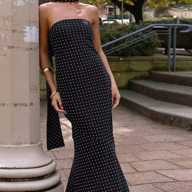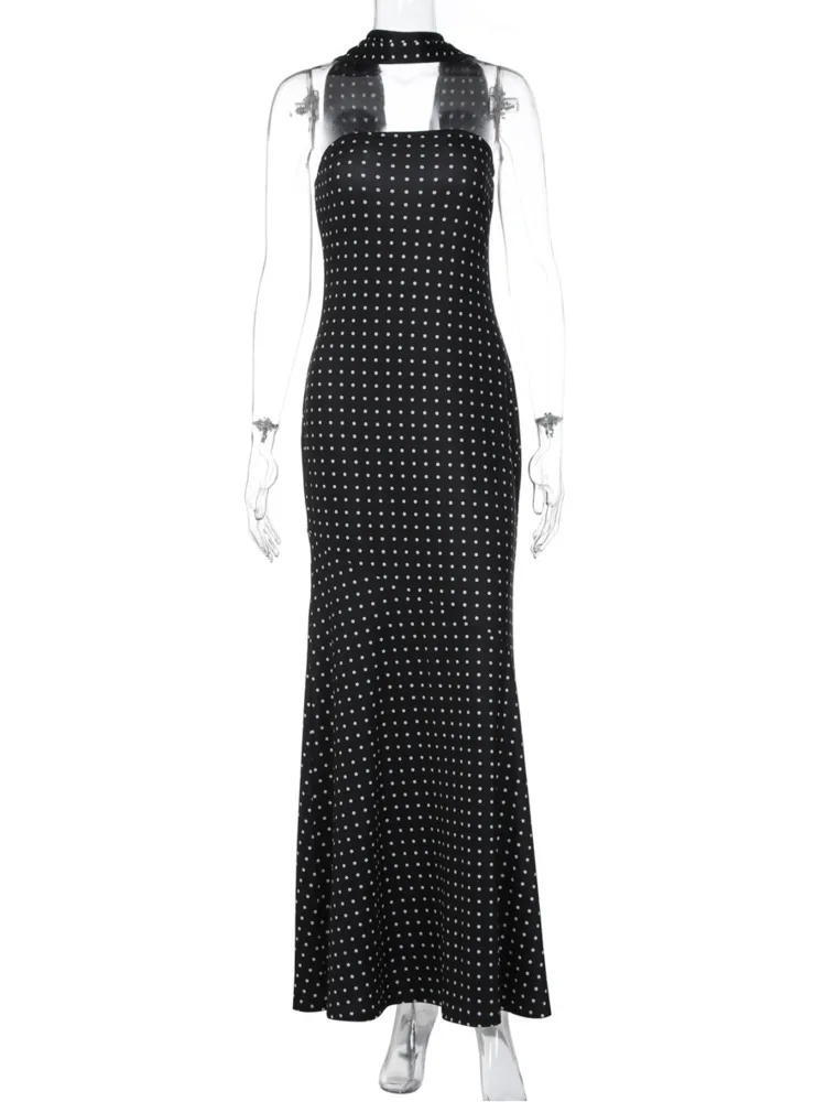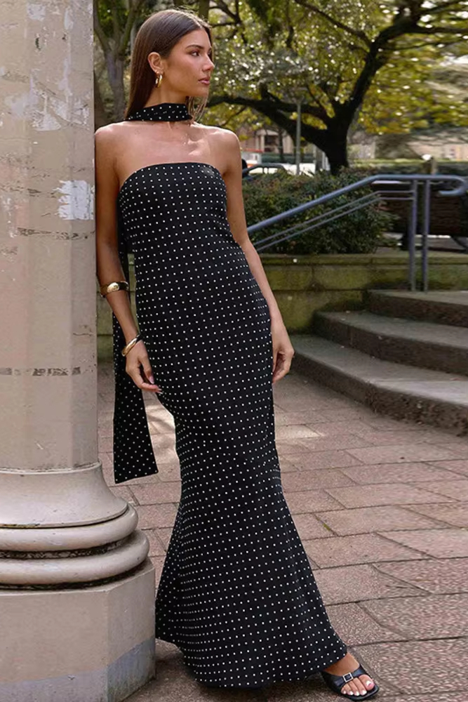 Victoria’s Vogue Polka Dot Strapless Sexy Maxi Dress Women Gown Elegant Scarf Collar Off-shoulder Backless Sleeveless Club Party Dress