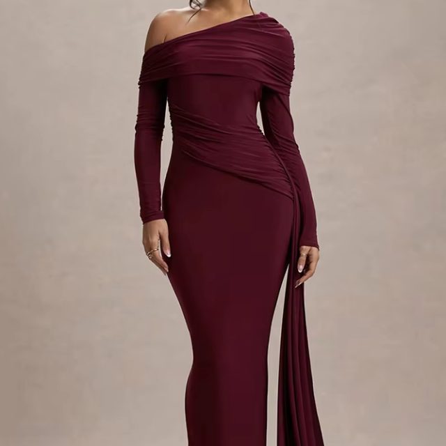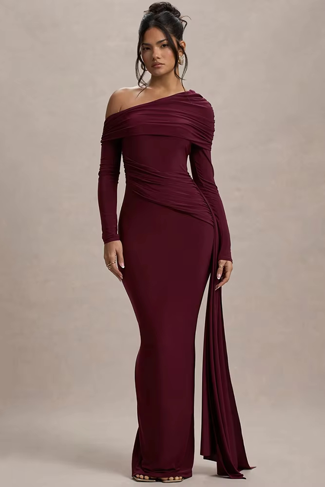 Victoria’s Vogue Skew Collar Long Sleeve Sexy Maxi Dress For Women Gown Fashion Backless Draped Ruched Bodycon Club Long Dress