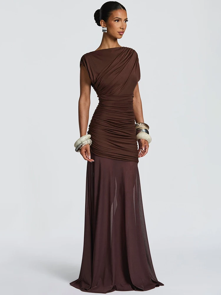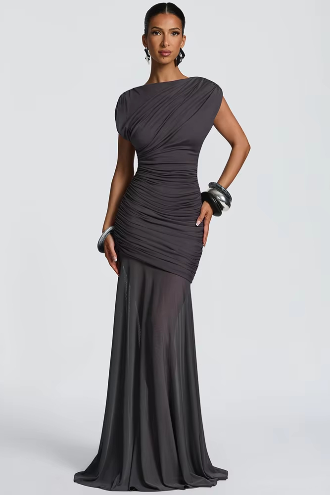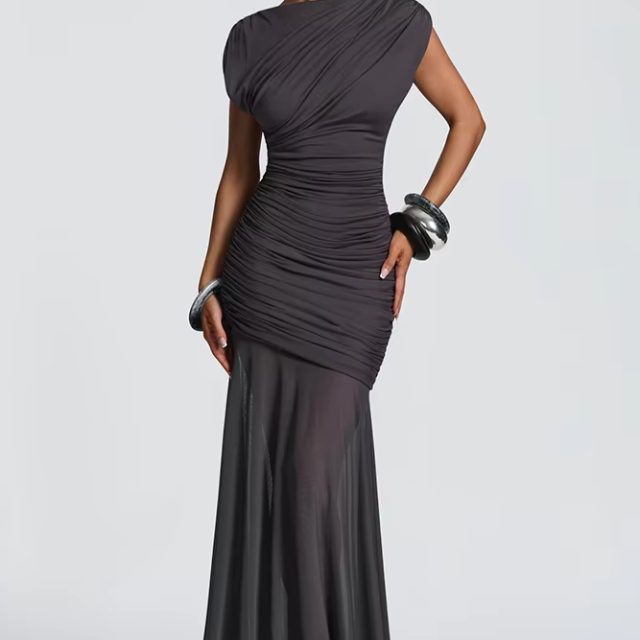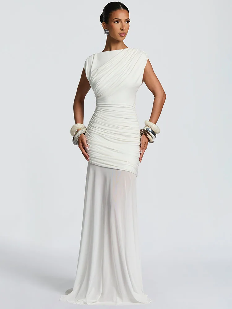 Victoria’s Vogue Sleeveless Ruched Sexy Maxi Dress Women Gown Elegant Patchwork Mesh O Neck High Waist Skinny Club Party Long Dresses