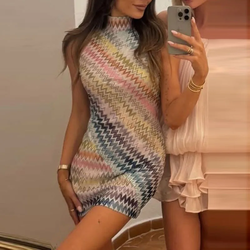 Victoria’s Vogue Striped Print Patchwork Hips Dress Woman Spring Stand Collar Elegant Party Dresses Summer Sleeveless Slim Mini Dress