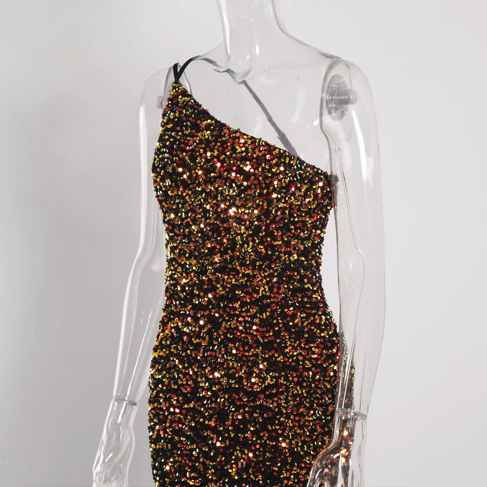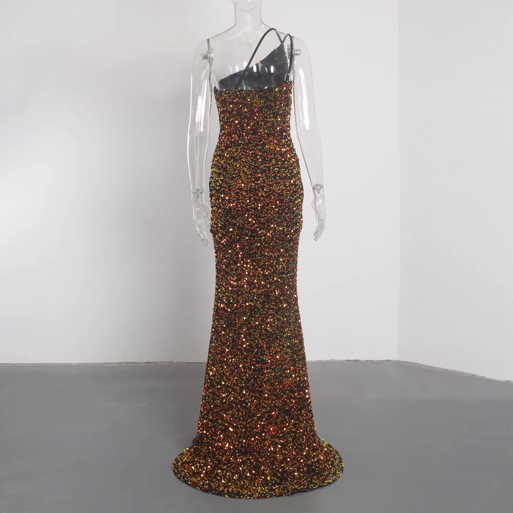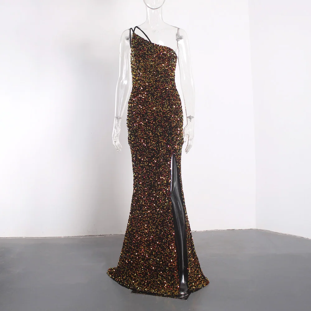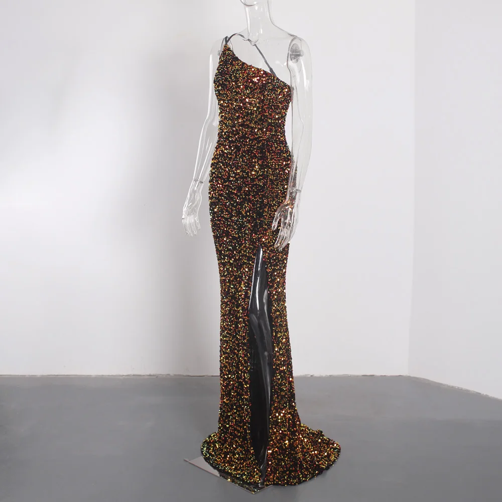 victoria’svogue 2021 Multi Gold Sequined One Shoulder Long Evening Party Dress Split Sleeveless Backless Stretchy Maxi Gown