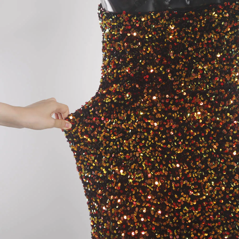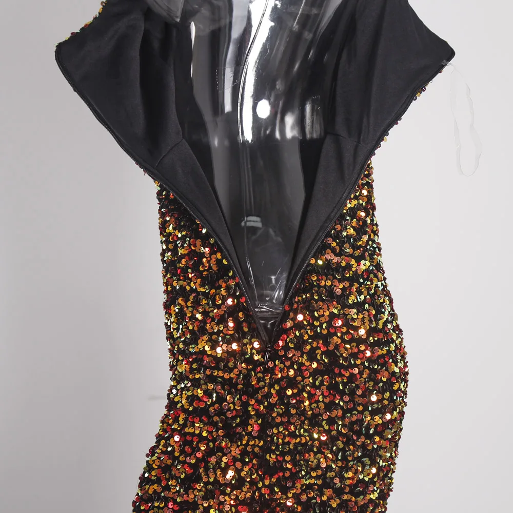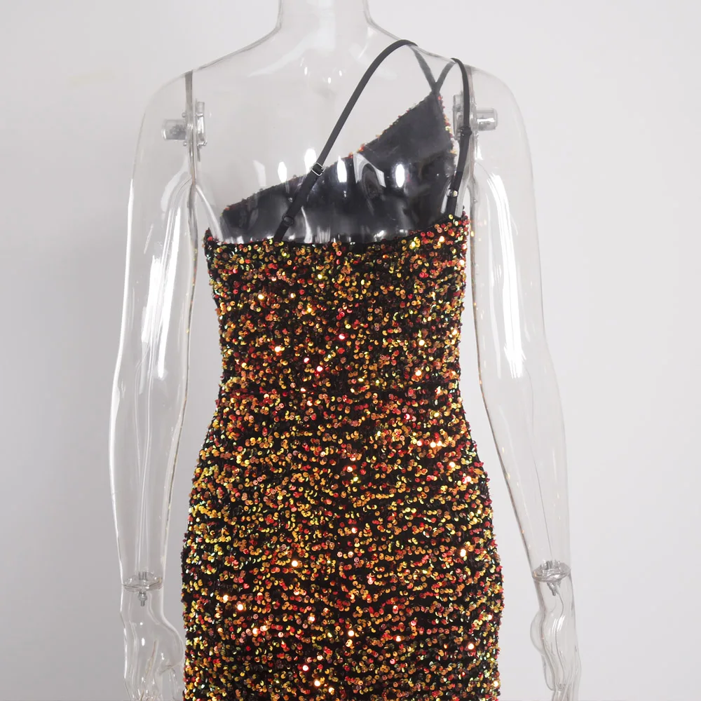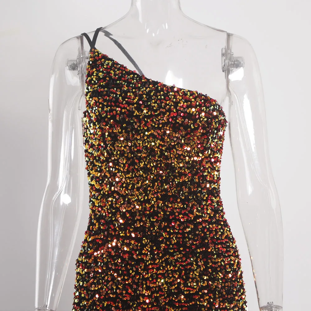 victoria’svogue 2021 Multi Gold Sequined One Shoulder Long Evening Party Dress Split Sleeveless Backless Stretchy Maxi Gown