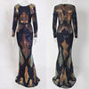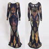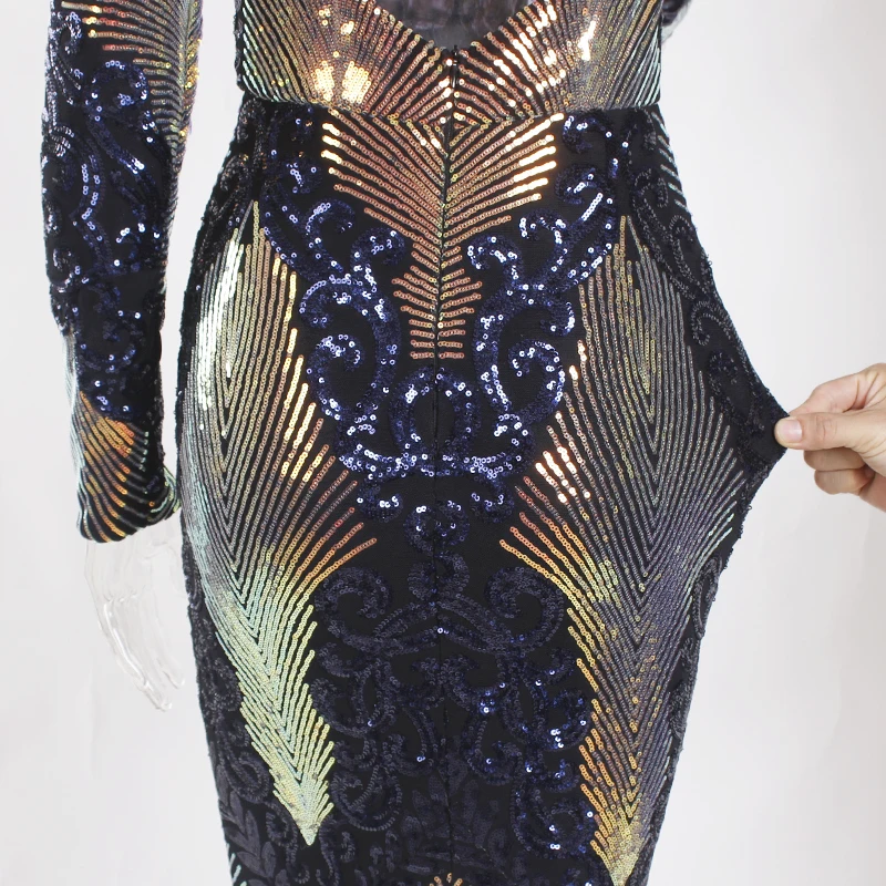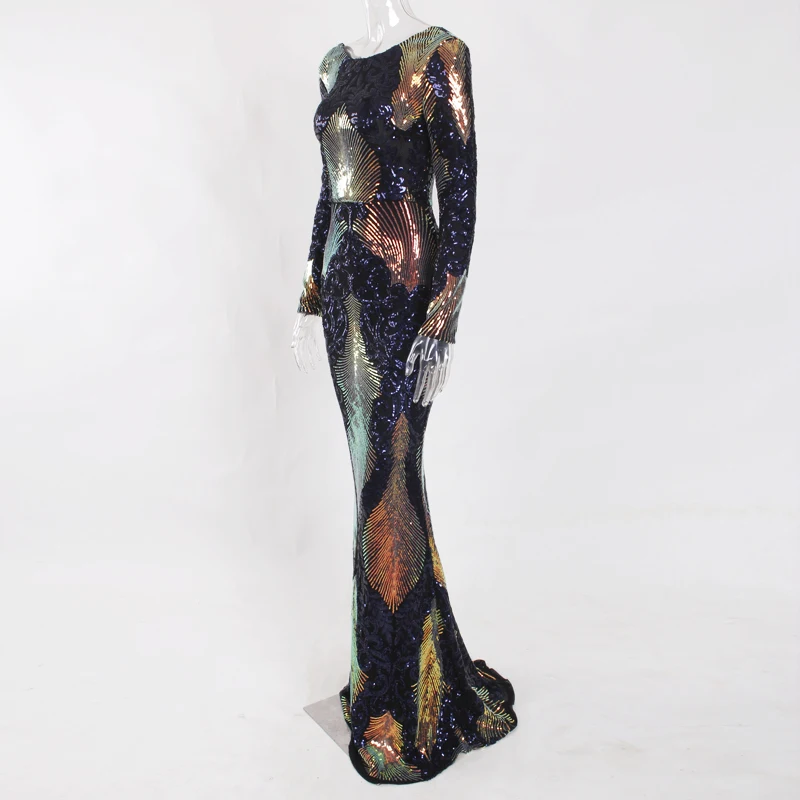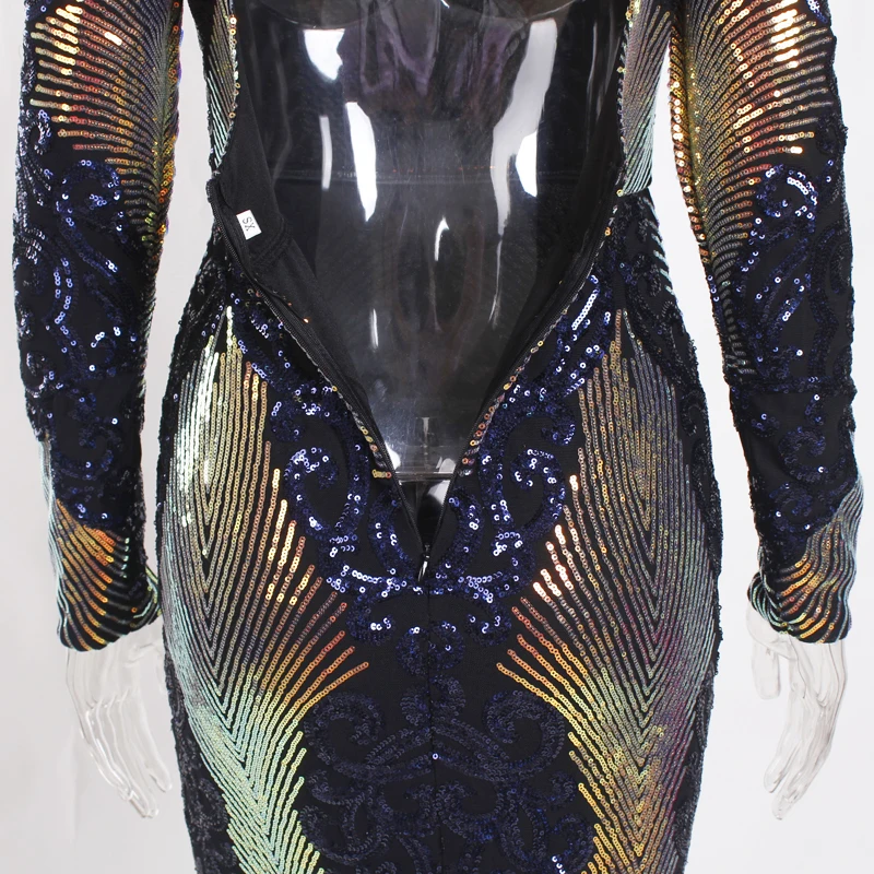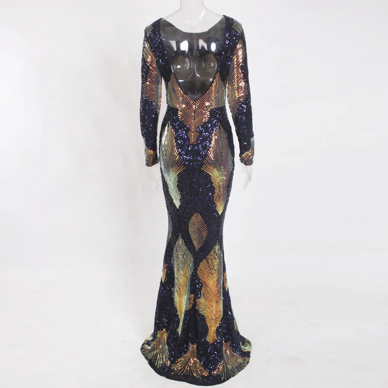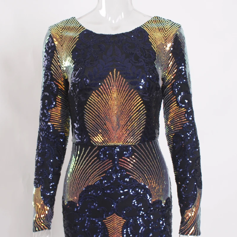 victoria’svogue 2021 Multicolor Stretchy Sequin Party Dress Long Sleeve O Neck Bodycon Floor Length Full Lining Open Back Geometric Club Dress