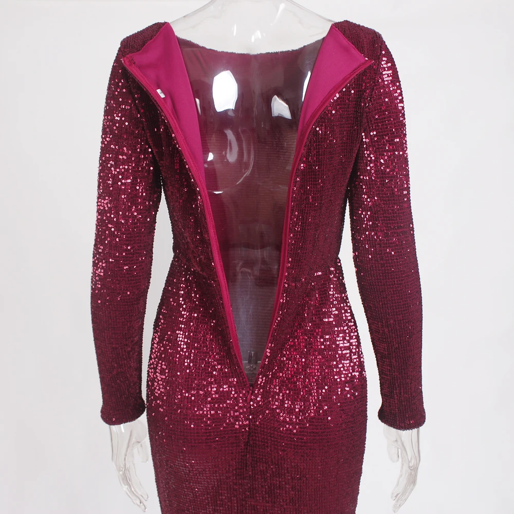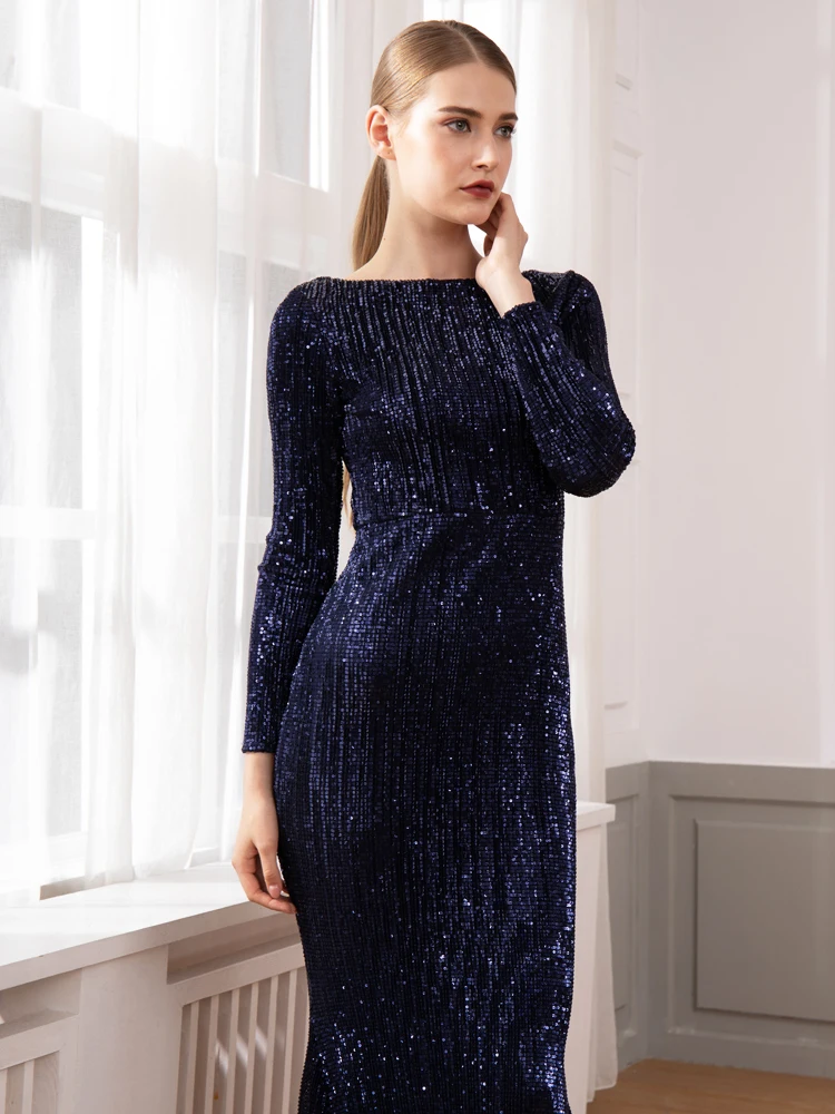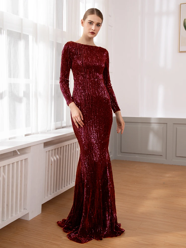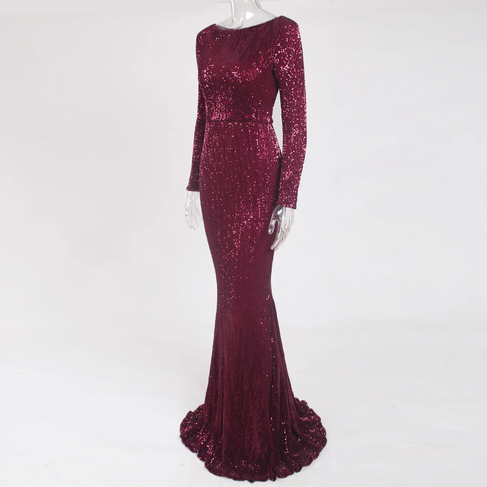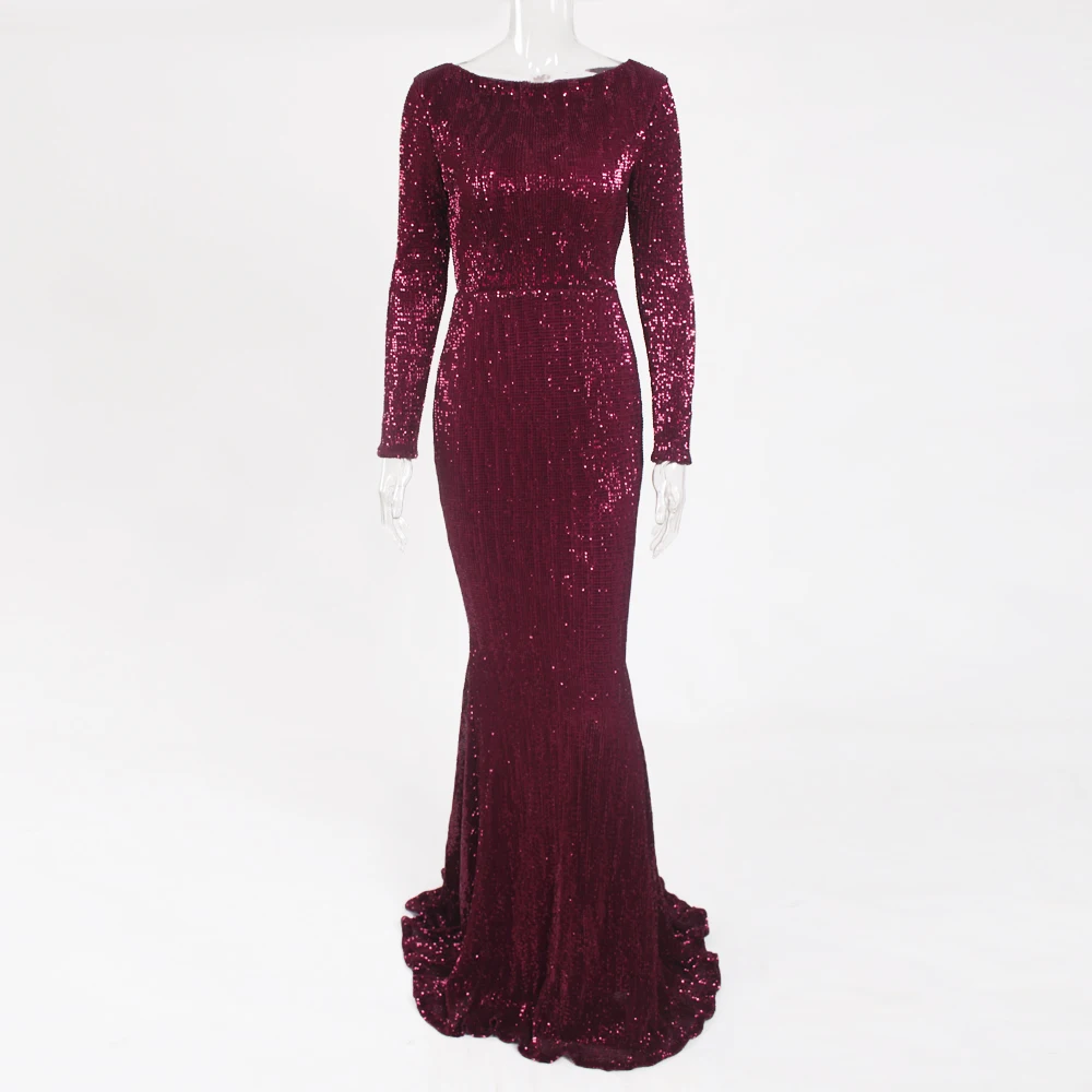 victoria’svogue 2021 New Burgundy Navy Long Sequined Maxi Dres Sleeve O Neck Shiny Party Dress Full Length Lining Bodycon Back Zipper Autumn Dress