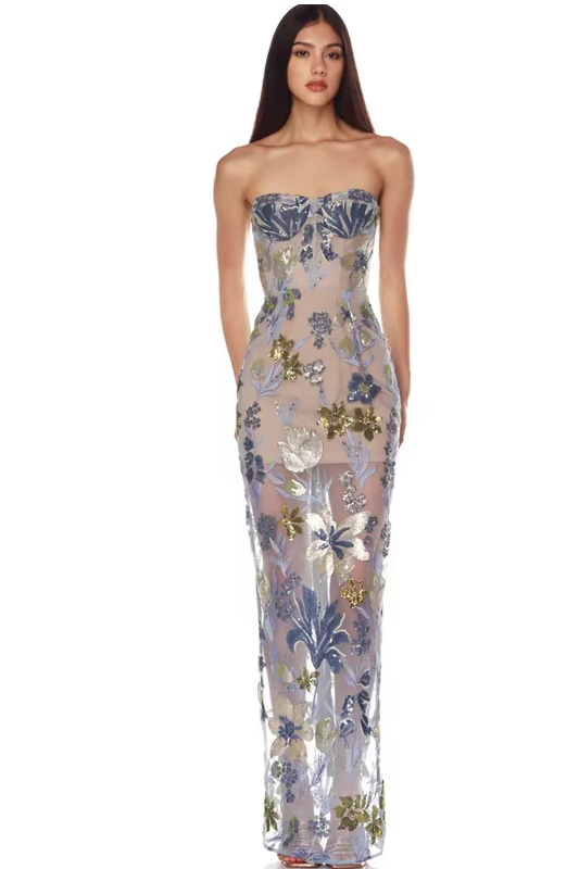 Victoria’s Vogue New sexy embroidered flower strapless simple dress, women’s slim fit strapless party dress, long style