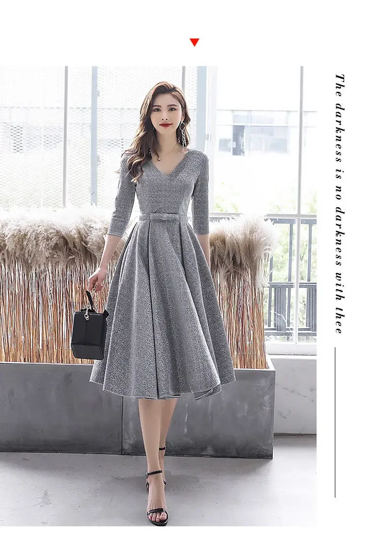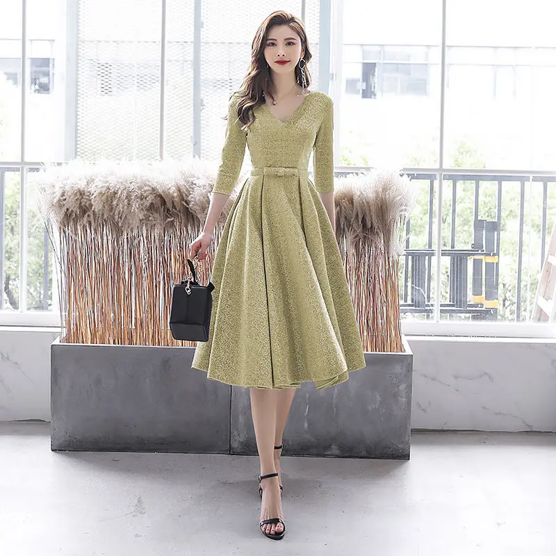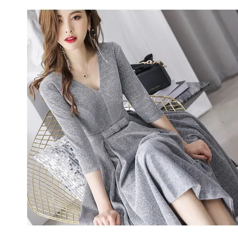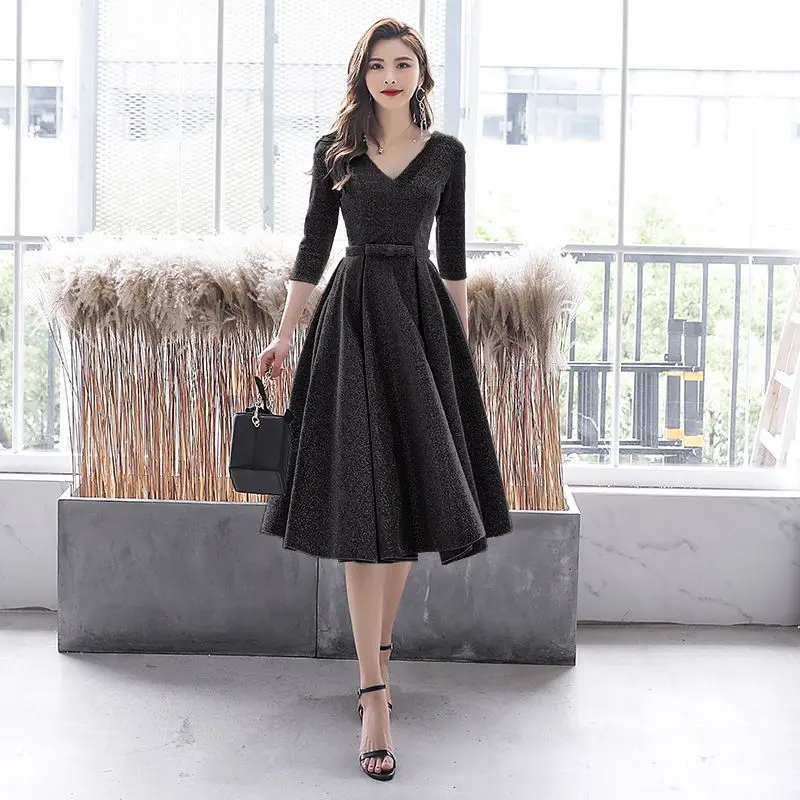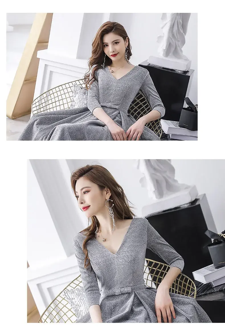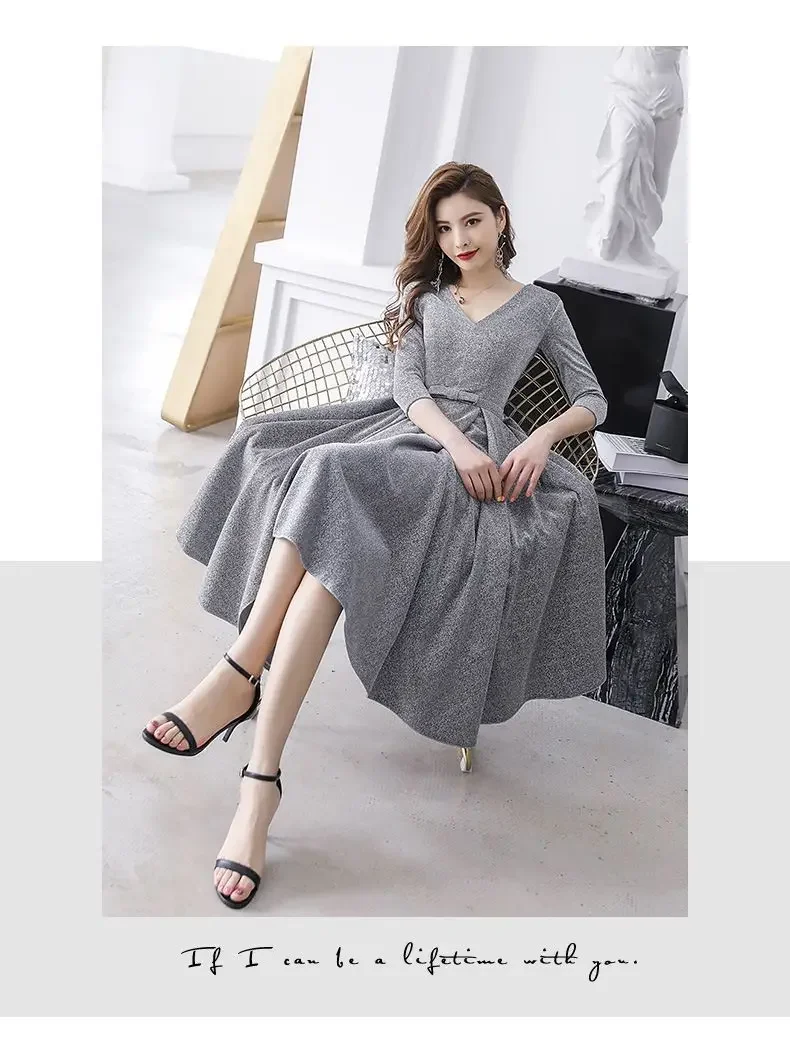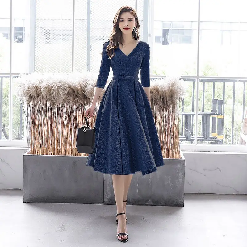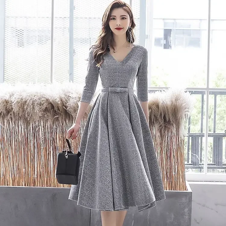 Victoria’s Vogue Luxury Solid Shoulder Straight Three Quarter Elegant Dress V-Neck Fashion High Waist Bow Pleats Prom Slim Evening Dresses