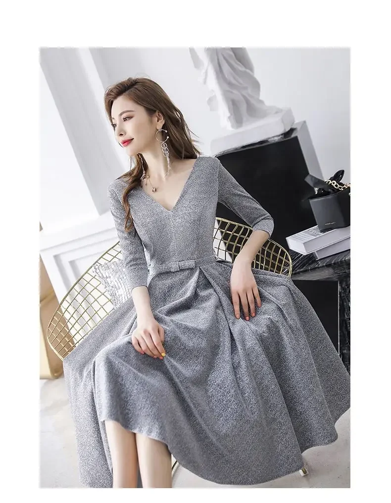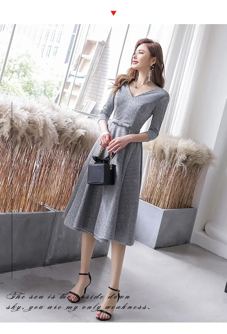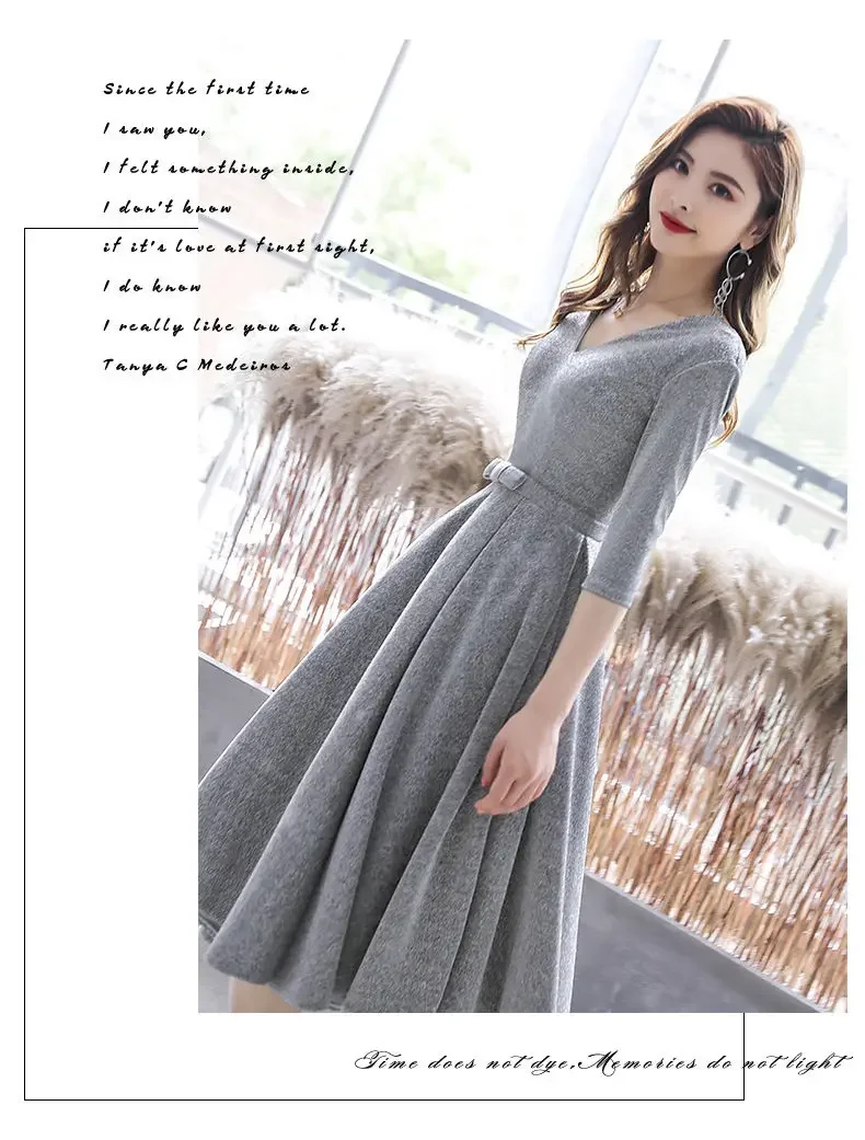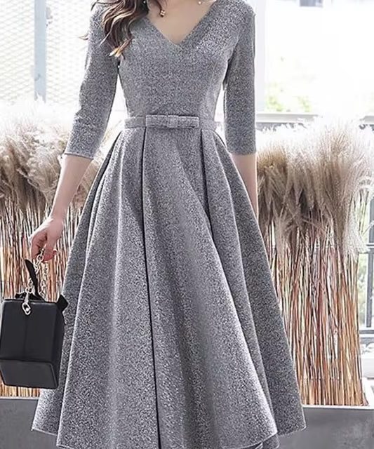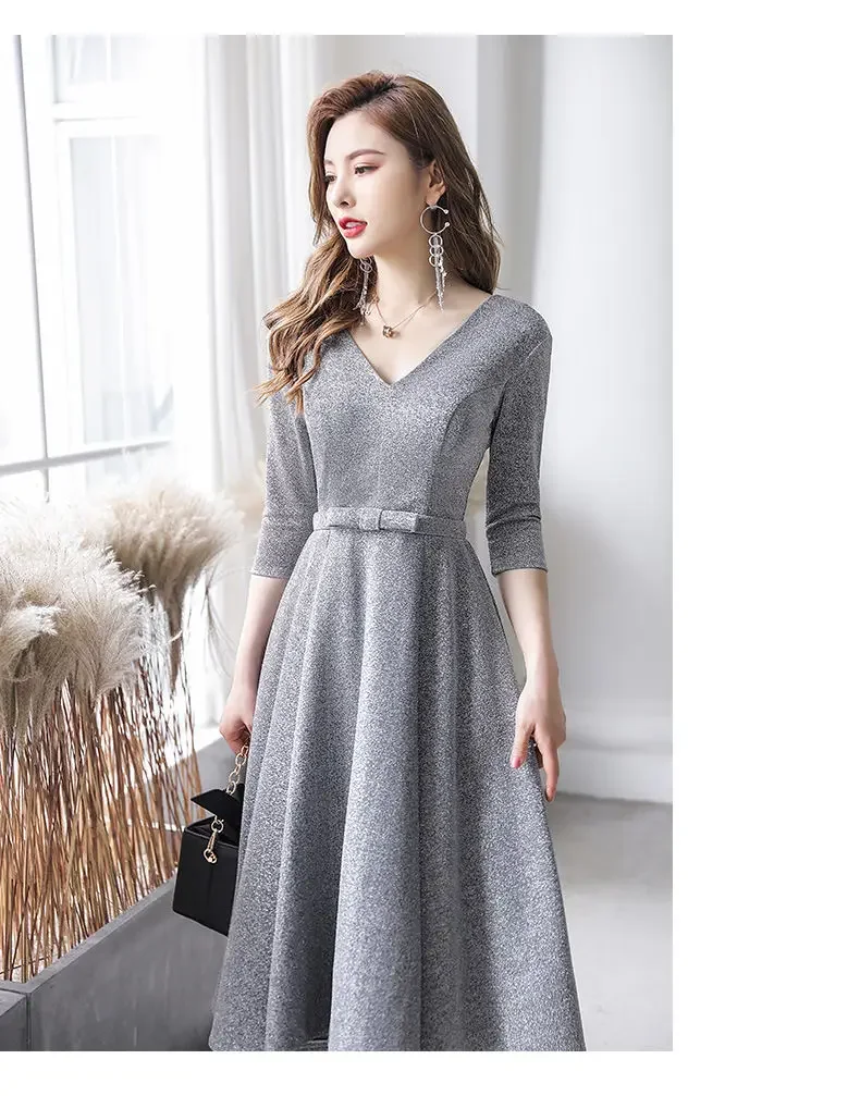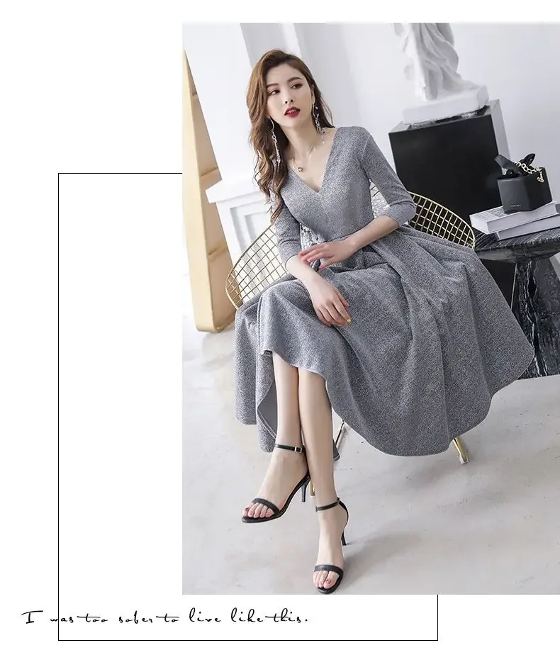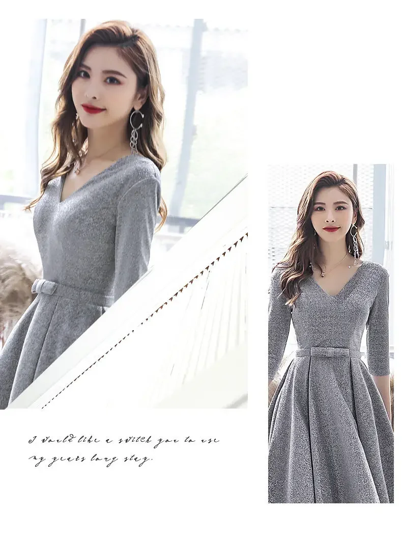 Victoria’s Vogue Luxury Solid Shoulder Straight Three Quarter Elegant Dress V-Neck Fashion High Waist Bow Pleats Prom Slim Evening Dresses