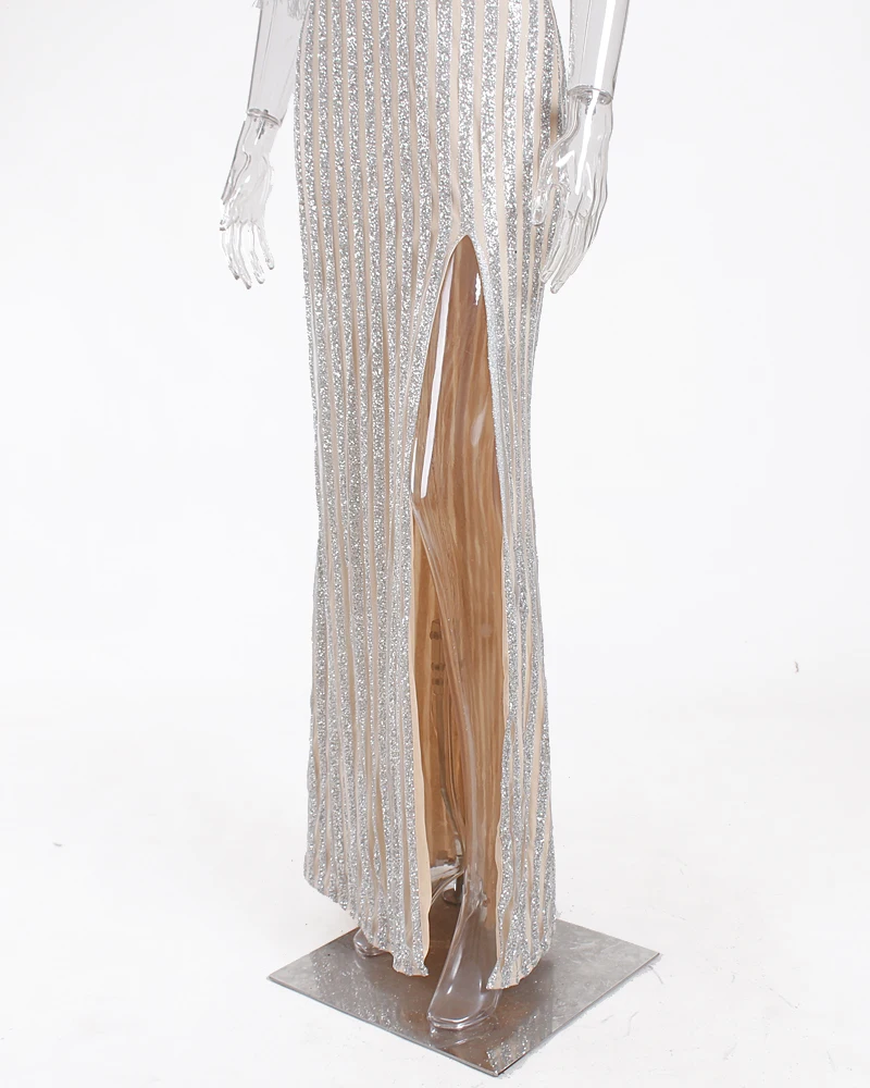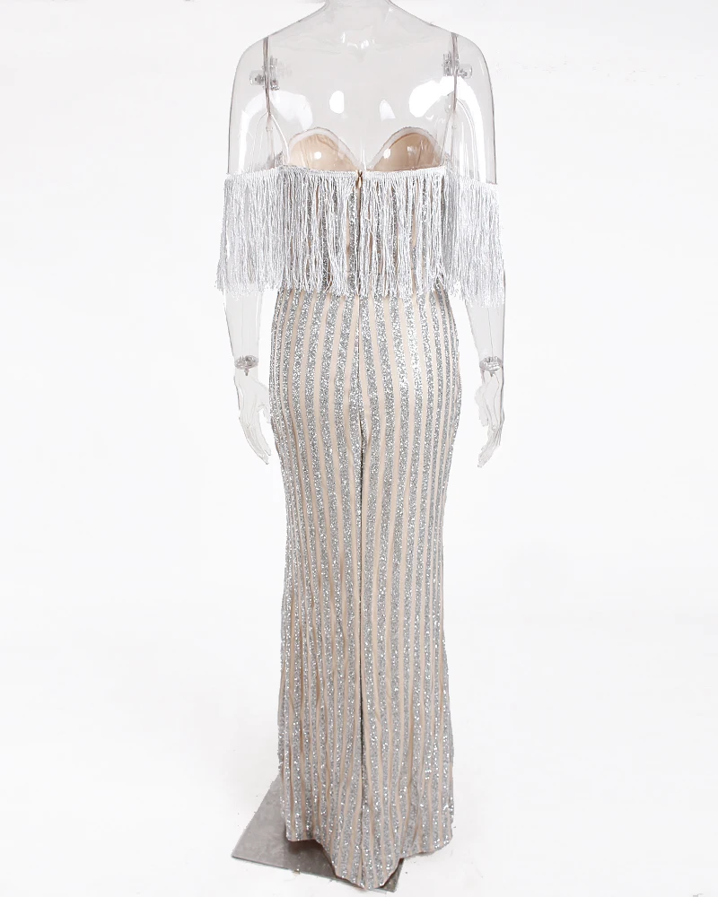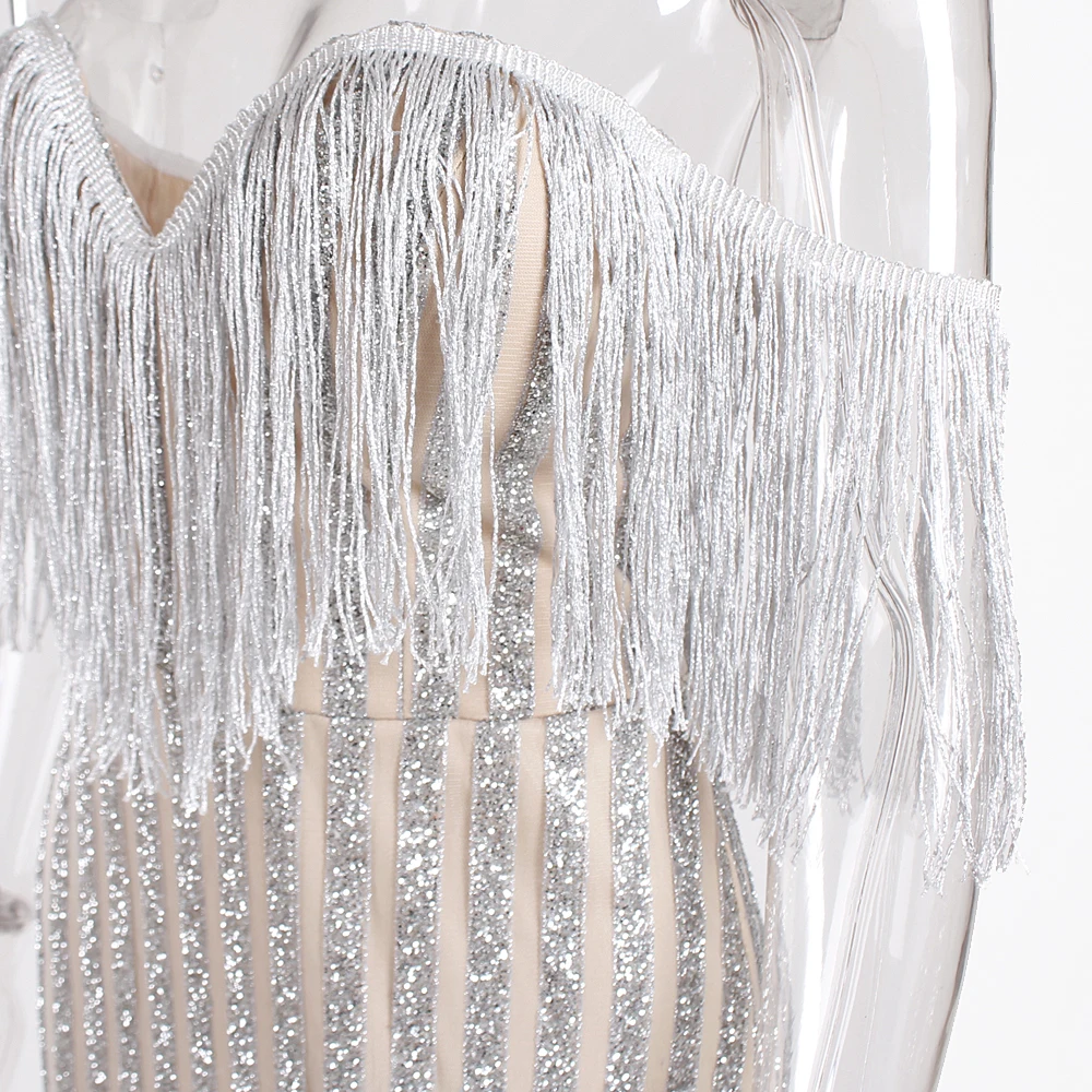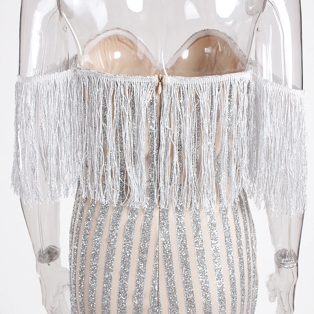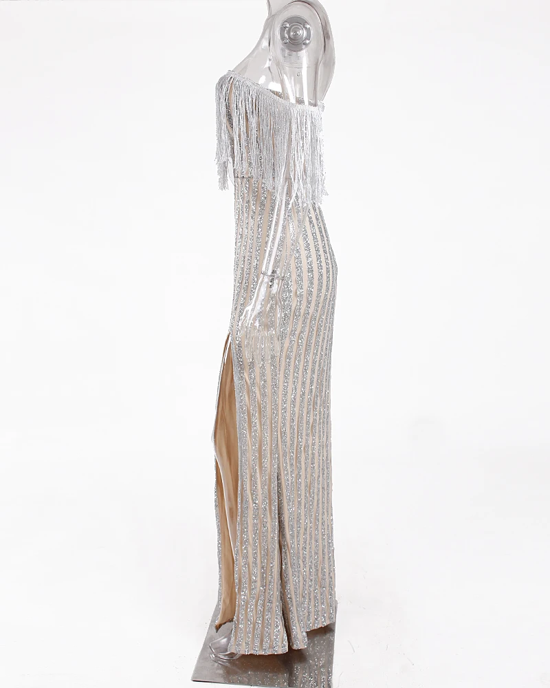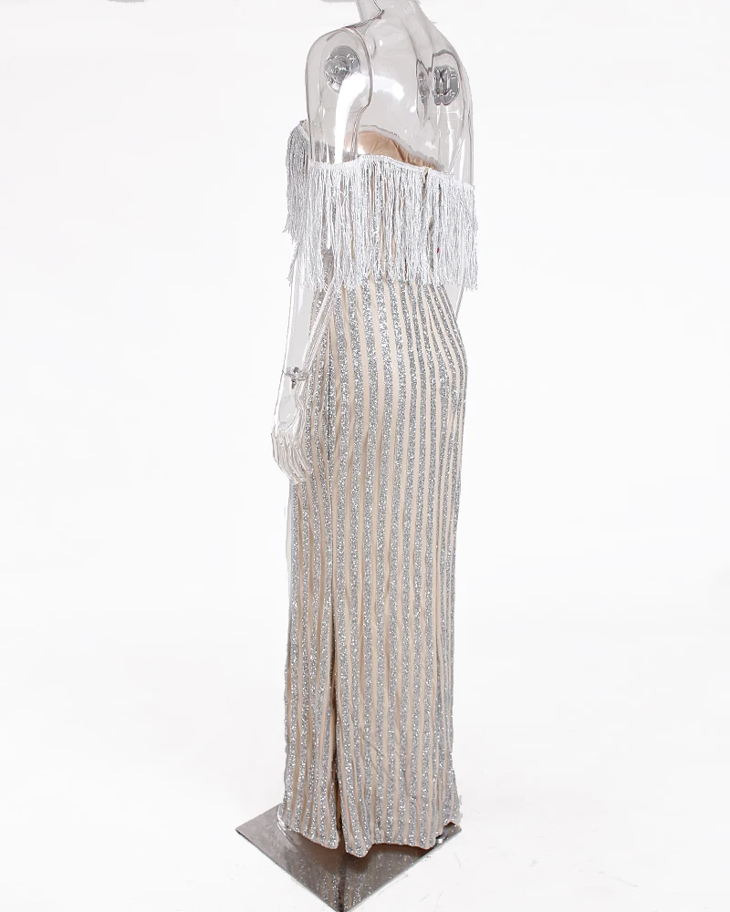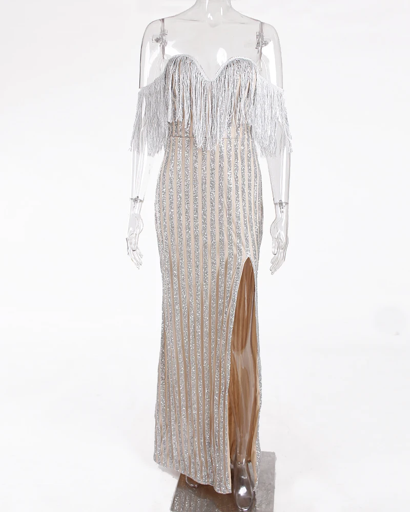victoria’svogue 2021 Off The Shoulder Glittered Patchwork Tassel Evening Party Dress Sexy Strapless Slash Neck Split Leg Elegant Shiny Long Dresses