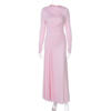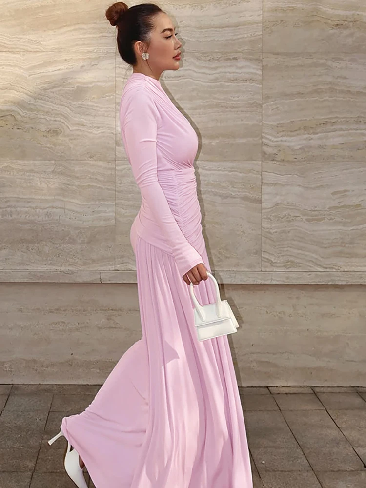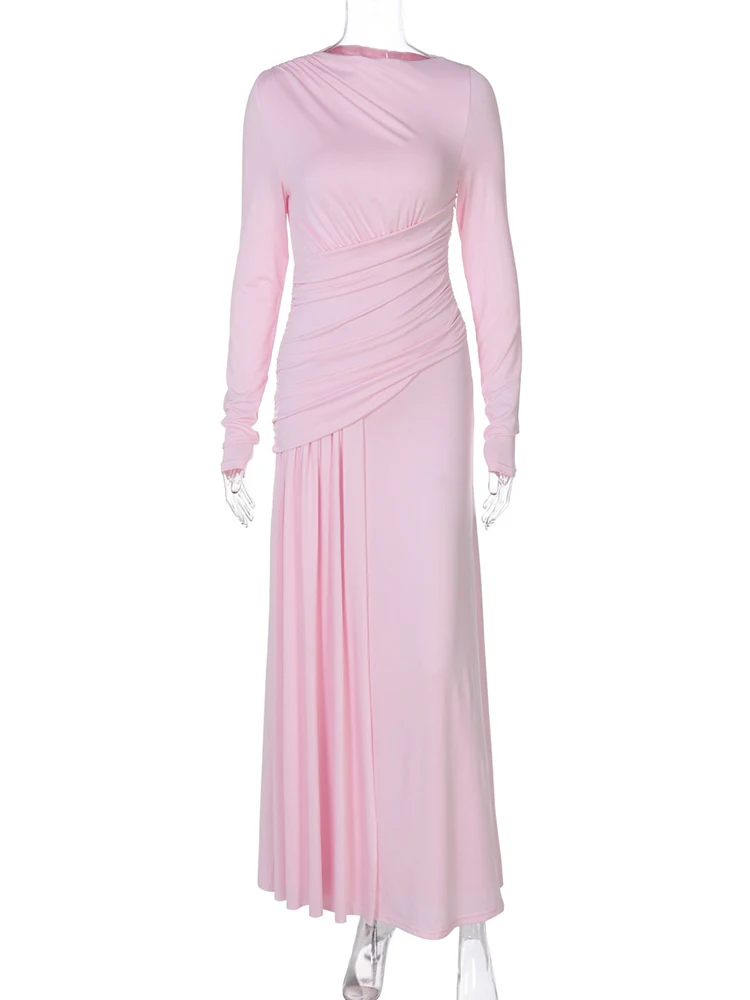 Victoria’s Vogue Elegant Round Neck Draped Maxi Dress For Women Pink Long Sleeve High Waist Dress Autumn Skinny Party Evening Dress 2025
