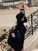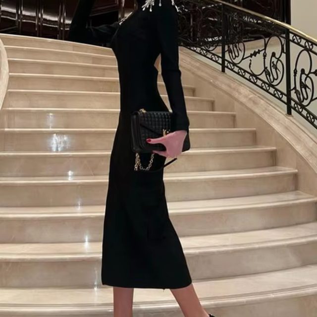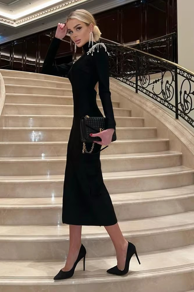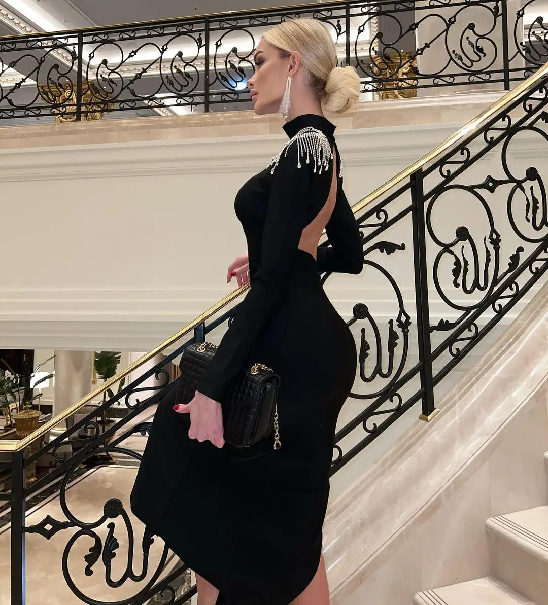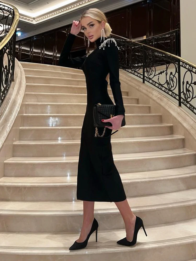 Victoria’s Vogue Party Dresses Women Fashion Sexy Club Streetwear Solid Full Slevees Turtleneck Backless Split Beading Sheath Long Vestidos Robes