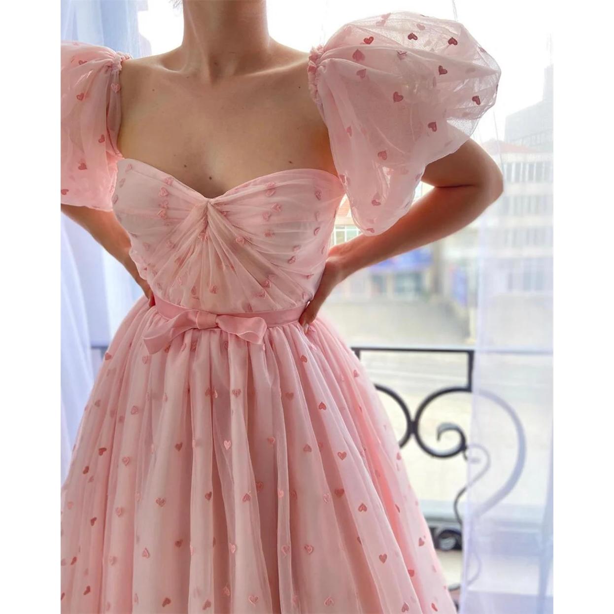 Step into a world where fashion meets fairy tale with our Pink Heart Tulle A-Line Prom Dress. Crafted with love and attention to detail, this dress is designed to make you the centerpiece of any event. Whether it’s a prom, wedding party, or a special birthday celebration, this dress ensures you look stunningly unforgettable. Its sweetheart neckline, short puff sleeves, and delicate A-line silhouette come together to create a look that’s both timeless and captivating.