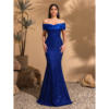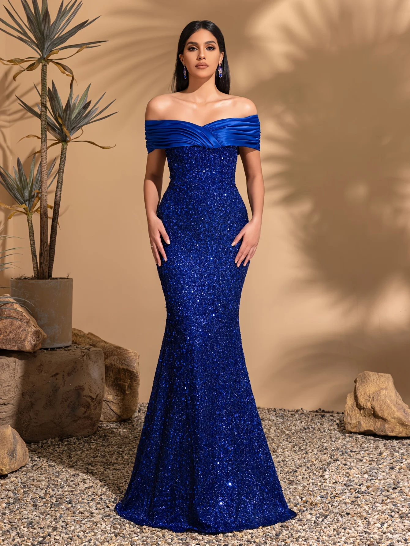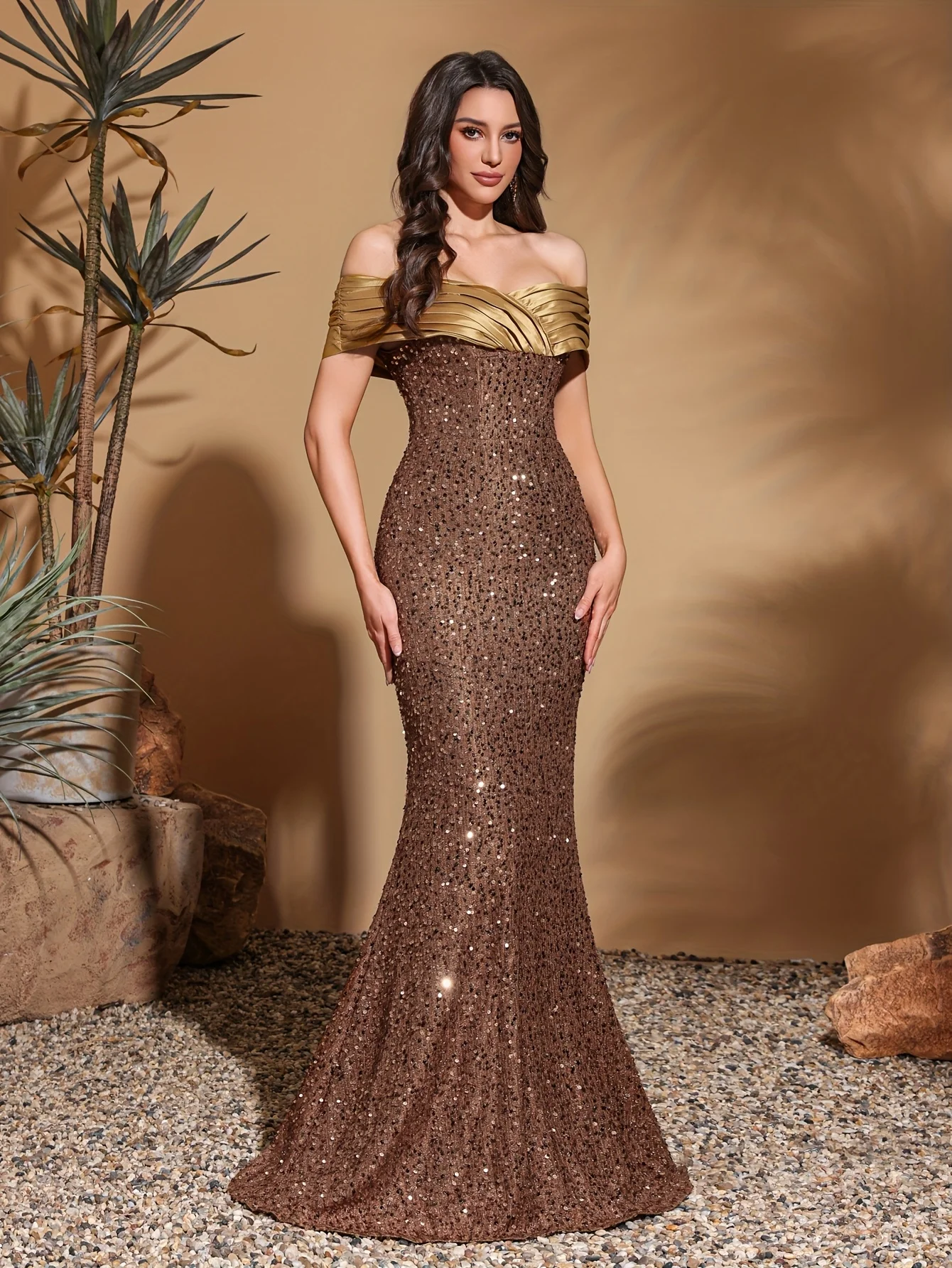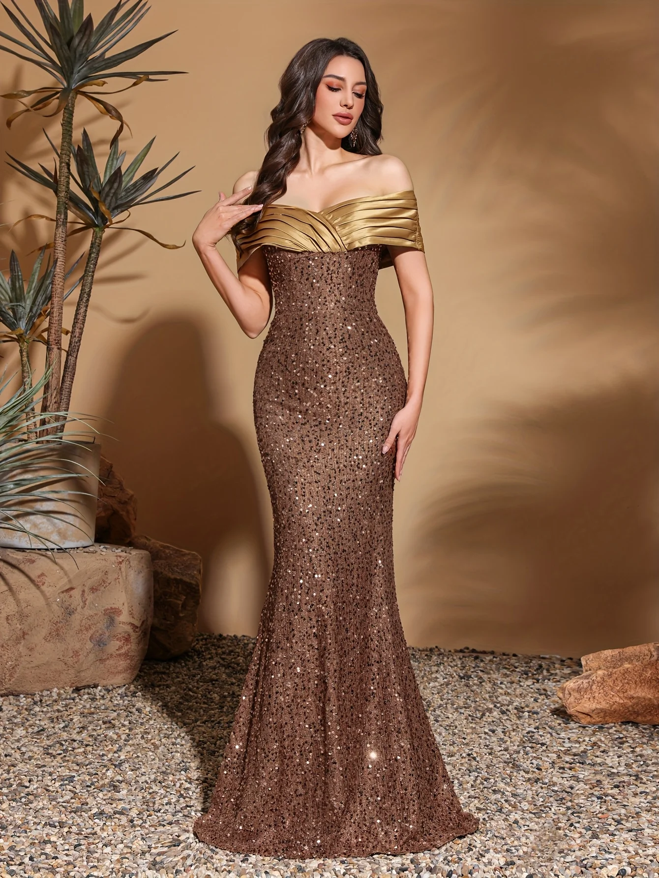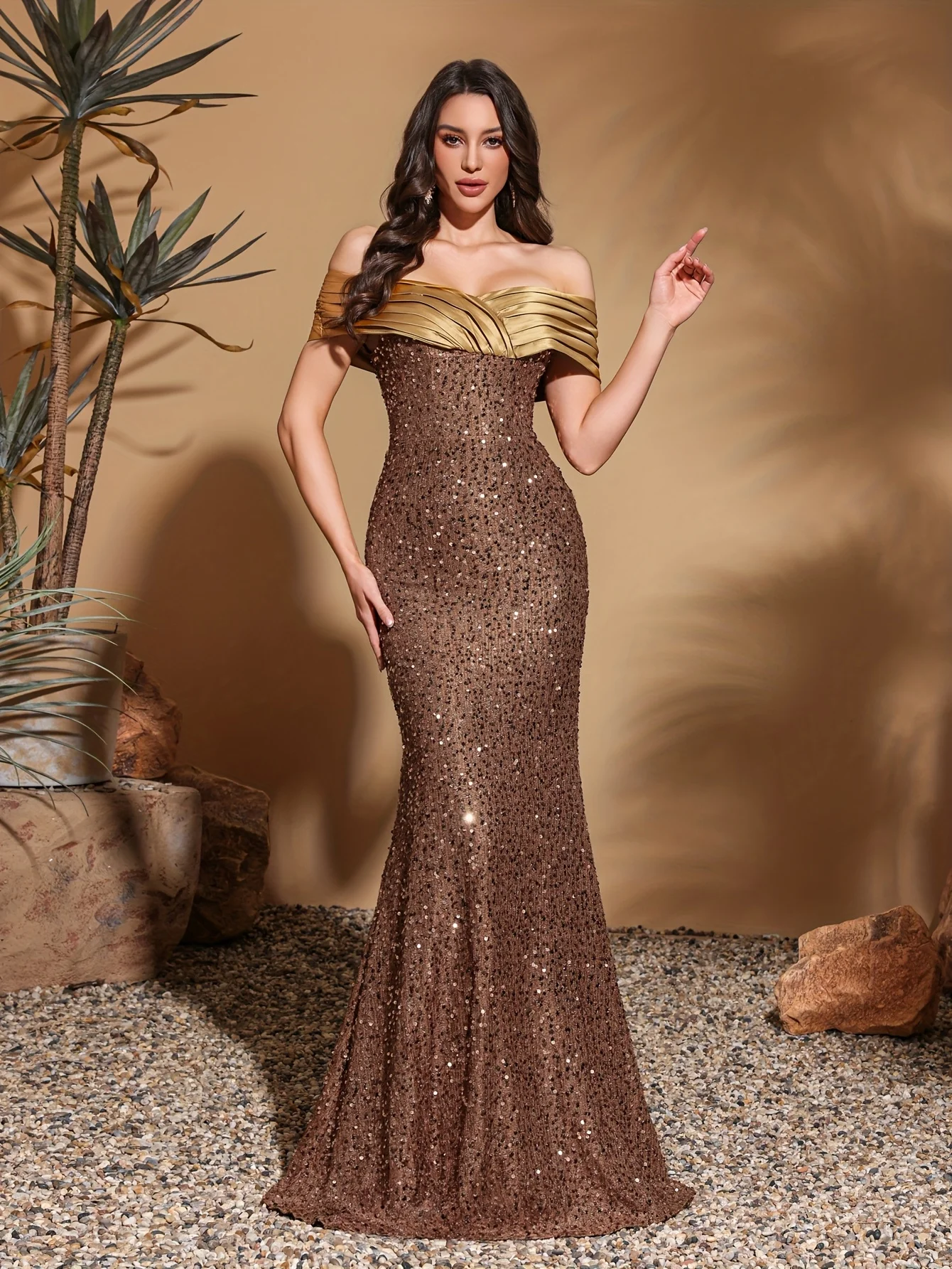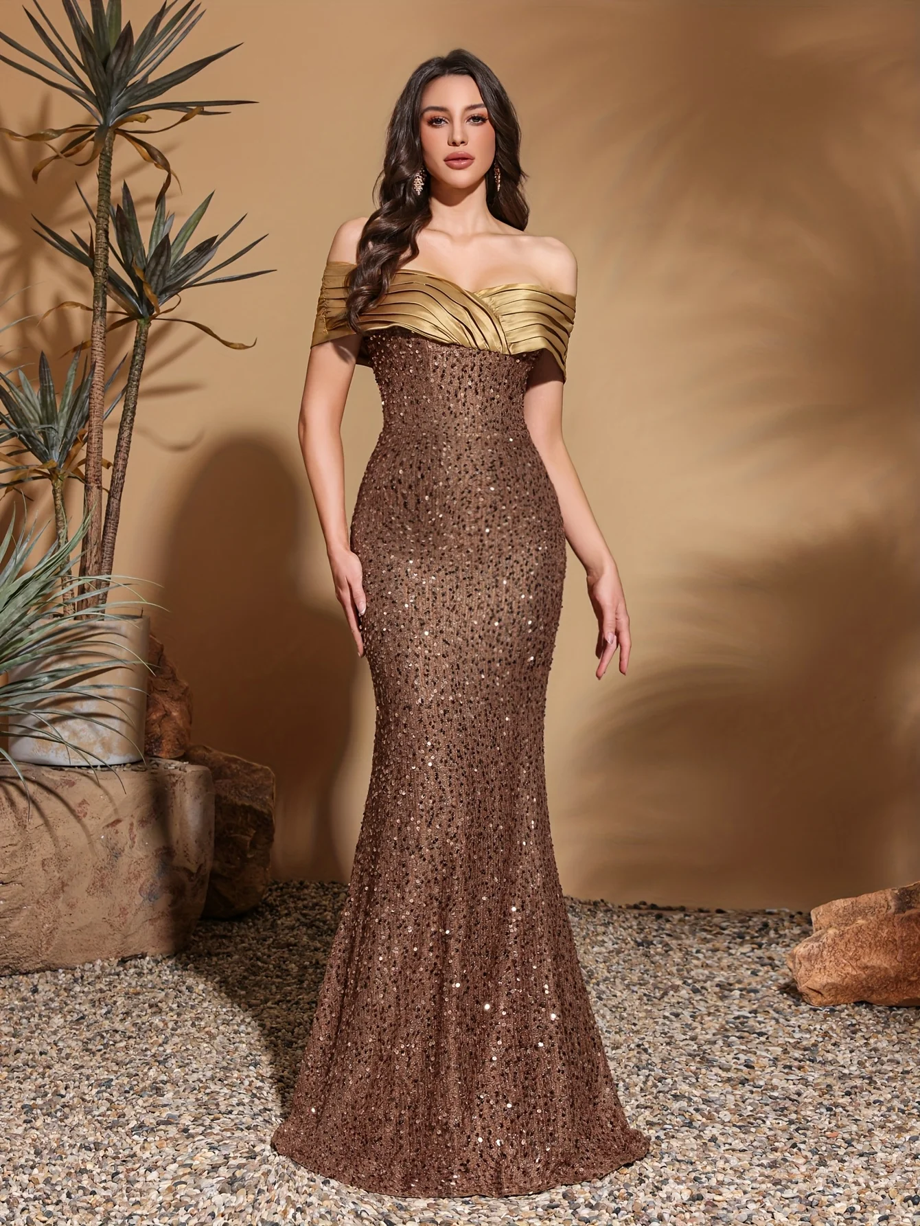 Victoria’s Vogue Pleated neckline sequined hip-length dress, elegant and chic dress