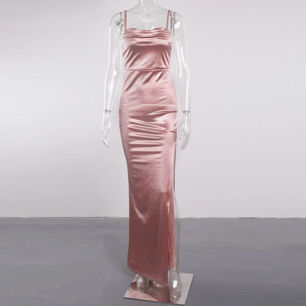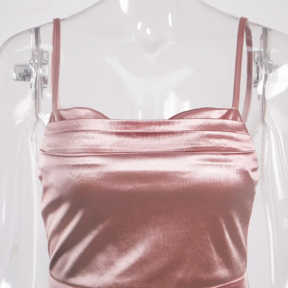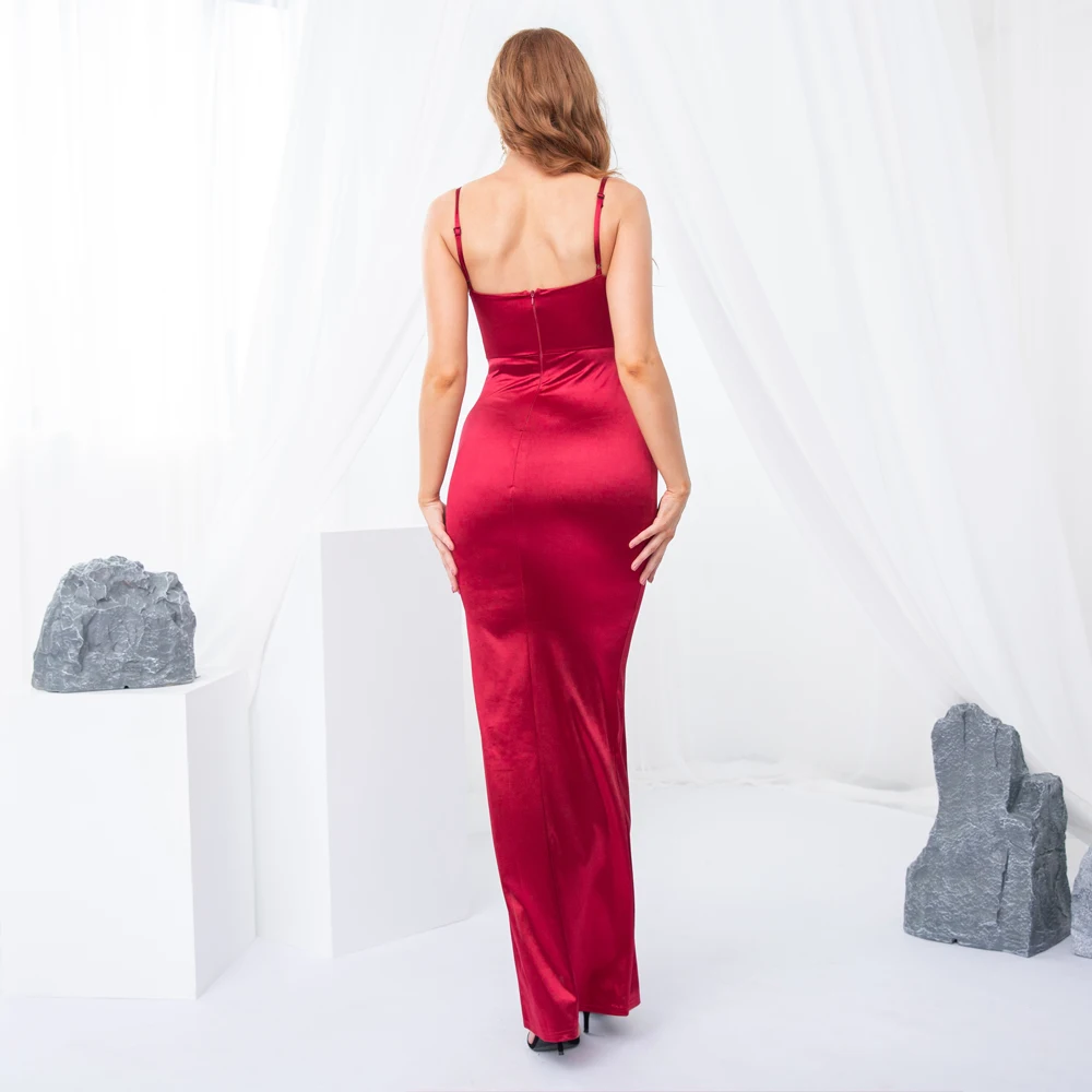 victoria’svogue 2021 Pleated Square Neckline Stretch Satin Summer Dress Spaghetti straps Sleeveless High Split Evening Party Dress Burgundy Green