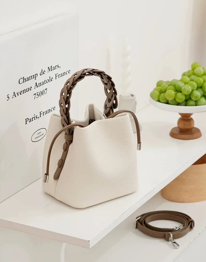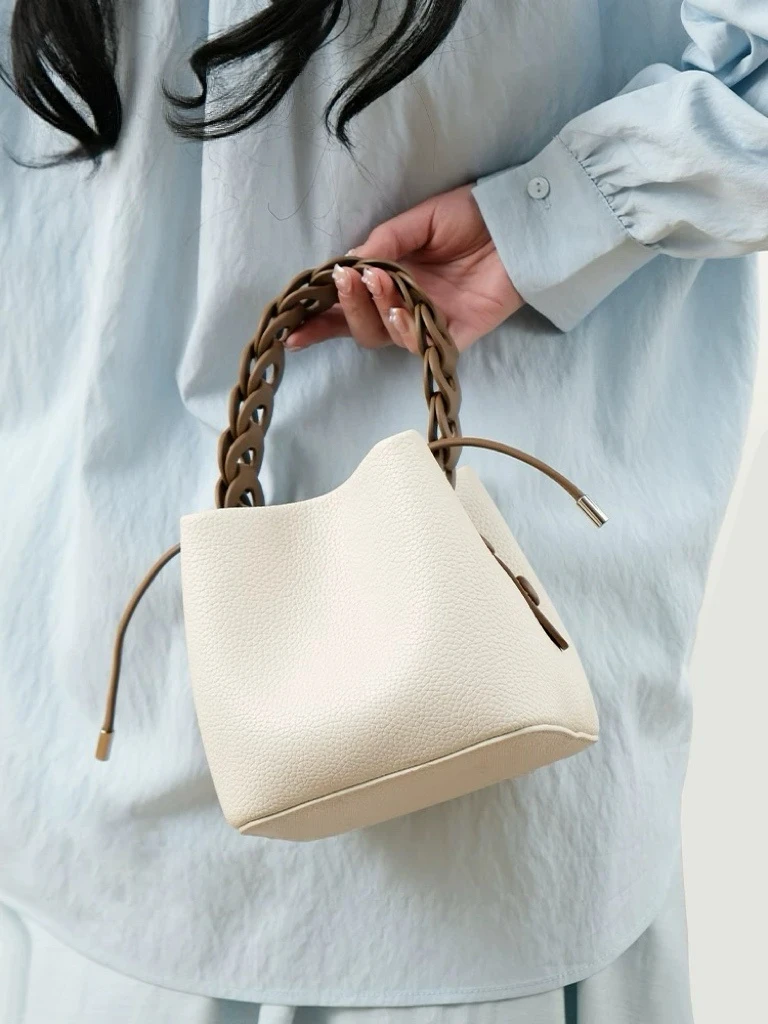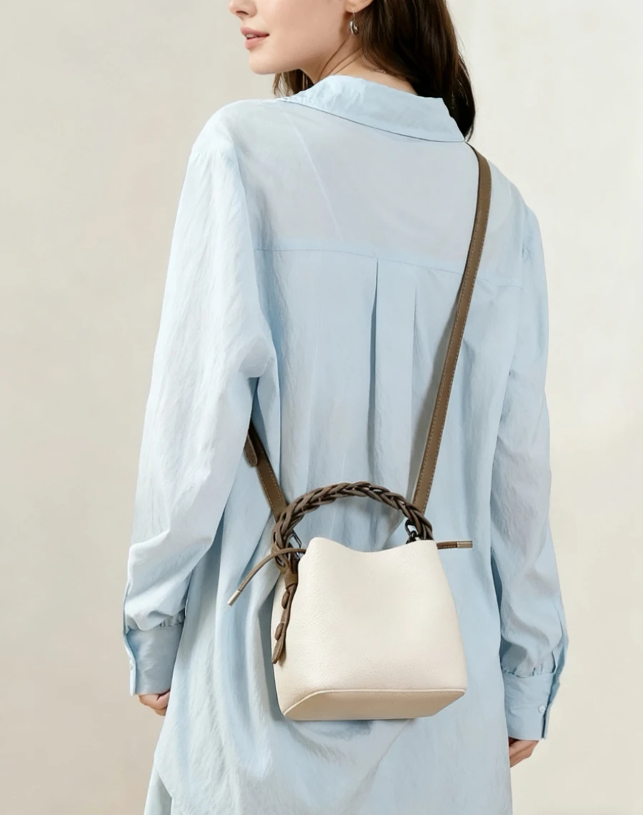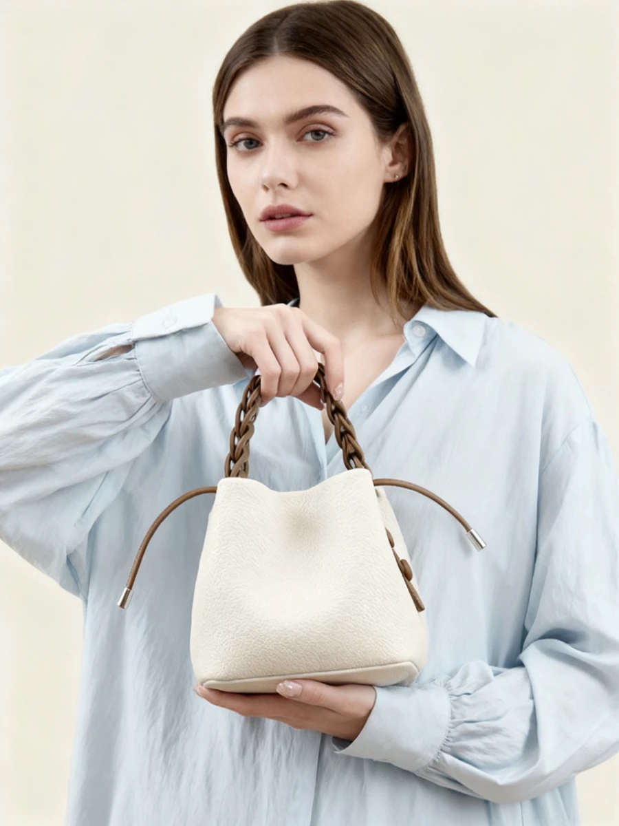 This bag is a bucket bag with a strong sense of design, made of fine lychee grain leather, which is of high quality and durable. The bag body is mainly in a soft tone, simple, elegant and easy to match. The most distinctive feature is its woven texture hand strap. The brown woven design not only adds a retro charm and craftsmanship to the bag but also enhances its overall fashion sense.