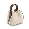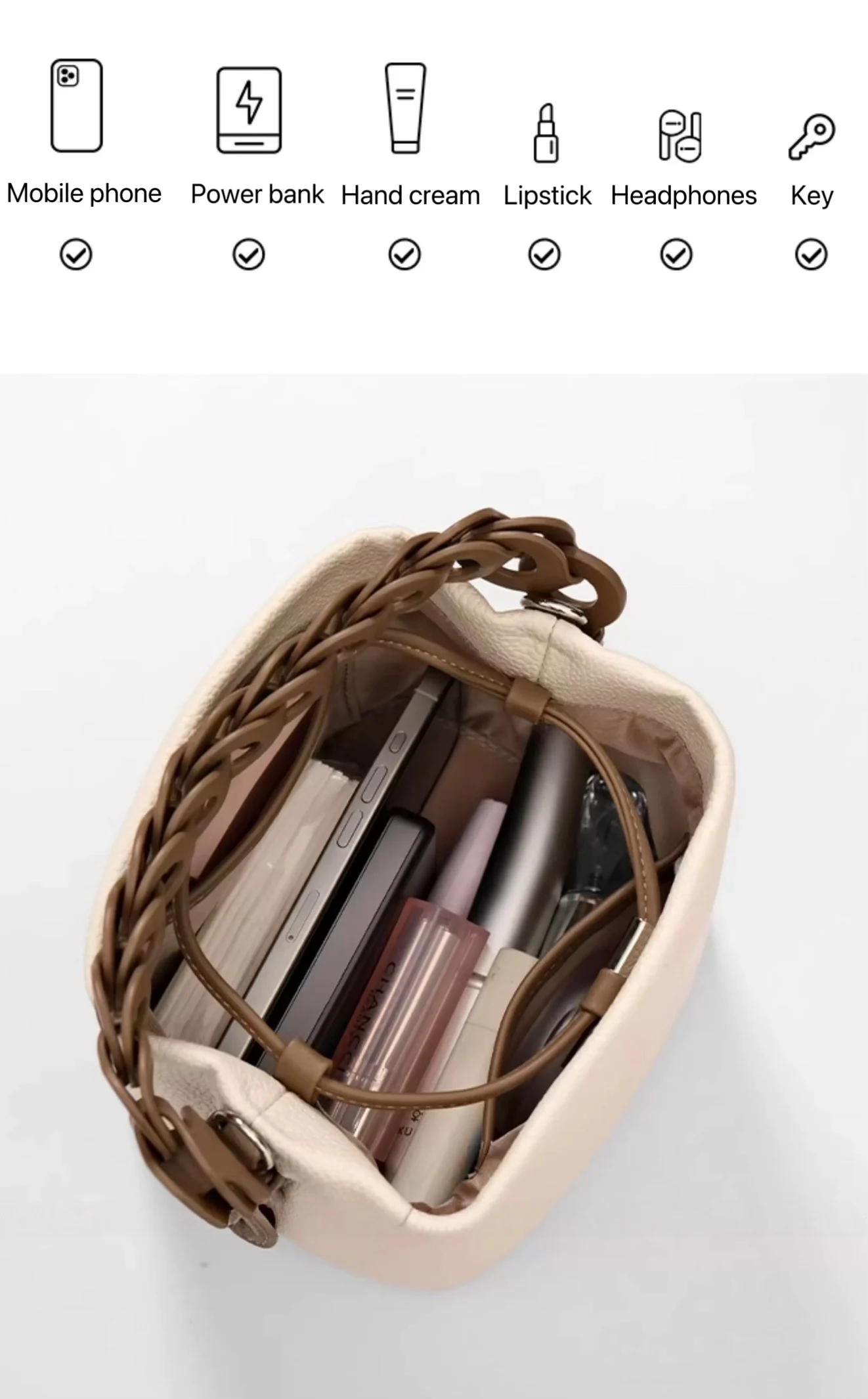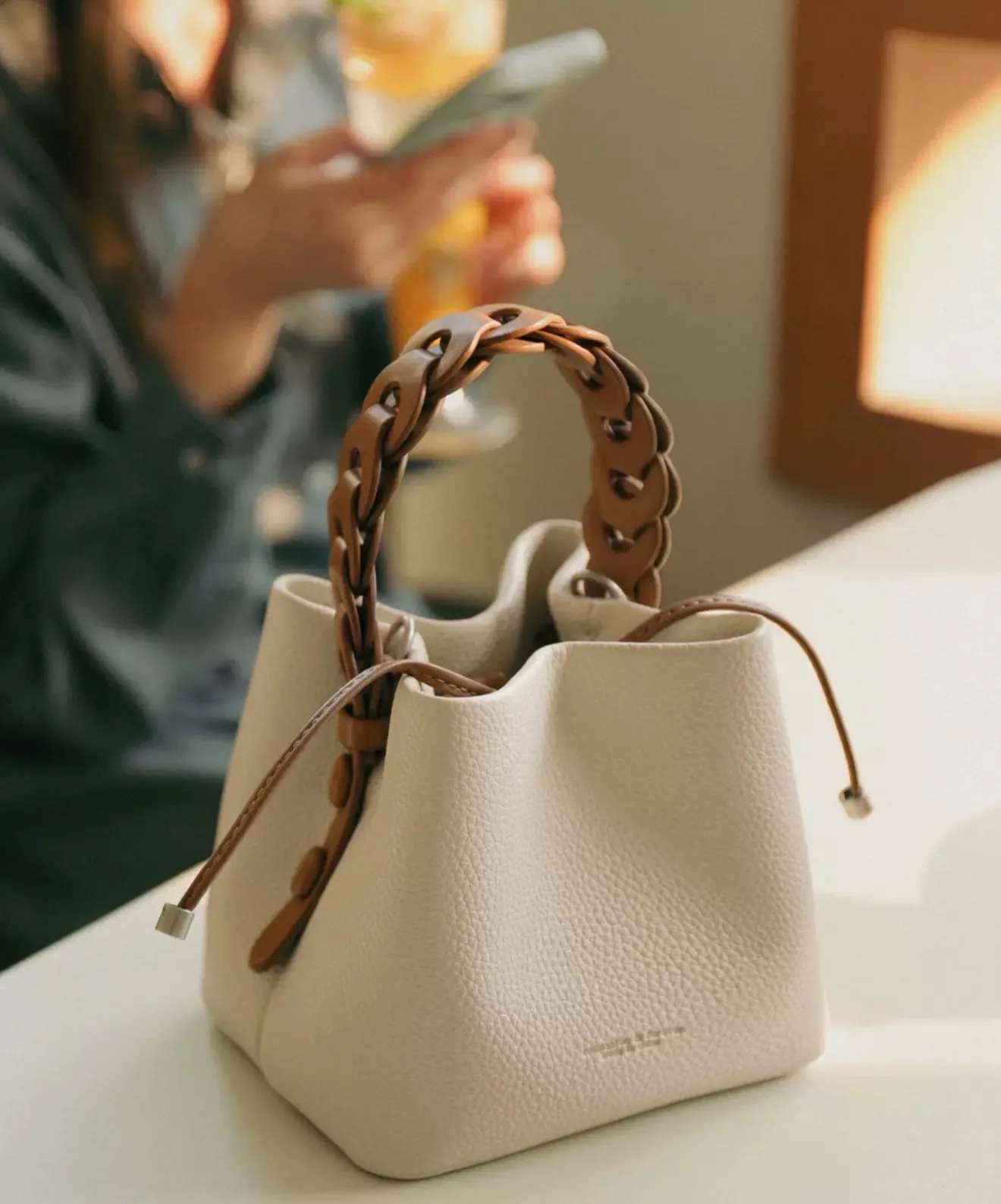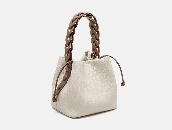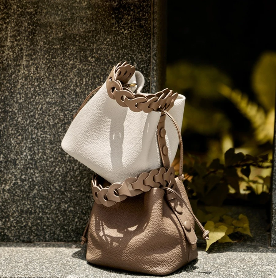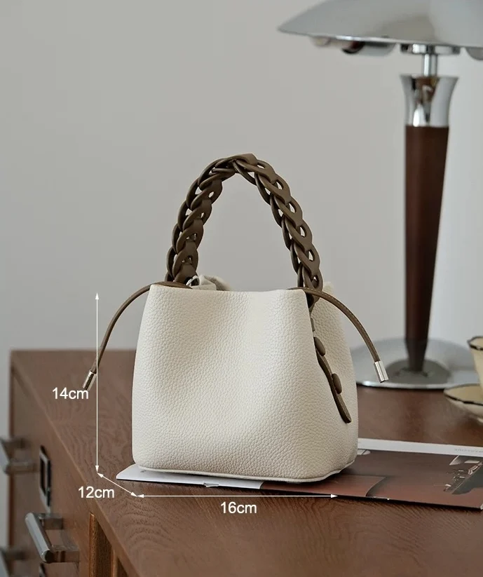 This bag is a bucket bag with a strong sense of design, made of fine lychee grain leather, which is of high quality and durable. The bag body is mainly in a soft tone, simple, elegant and easy to match. The most distinctive feature is its woven texture hand strap. The brown woven design not only adds a retro charm and craftsmanship to the bag but also enhances its overall fashion sense.