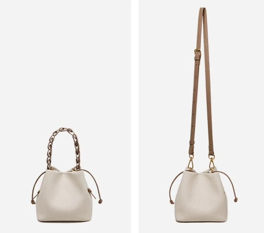 It adopts a drawstring opening and closing design, which is both aesthetically pleasing and practical. In terms of carrying methods, it offers you multiple options, such as hand-carried, single-shoulder, and crossbody, meeting the matching needs of different scenarios. It is suitable for fashion enthusiasts who pursue a simple and elegant look.