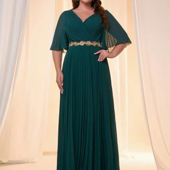 Victoria’s Vogue A large-sized lady’s Mgiacy V dress with a toothpick folded irregularly crossed flared sleeves, golden three-dimensional lace, su