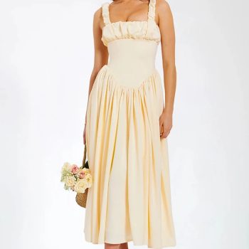 Victorias Vogue Elegant Satin Backless Midi Dress For Women High Quality Sundress Fashion Square Collar Sleeveless Loose Pleated Dress