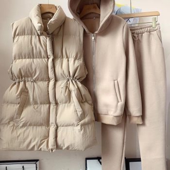 victoria’svogue 2021 New Arrival Padded Vest Zip Hooded Trousers Women Winter Warm 3pcs Sweatpants Suit Solid Color M-XL