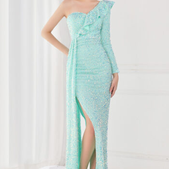 victoria’s vogue Fashion Women Light Blue Sequin Party Dress One Shoulder Ruffles Evening Dress Maxi Sexy Side Split Long Dress