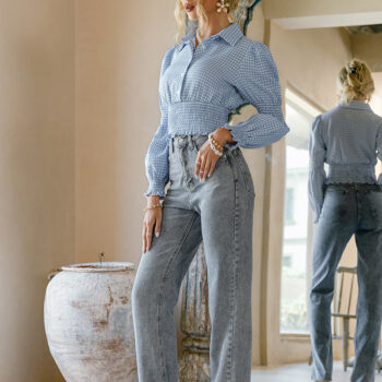 victoria’s vogue Office lady plaid elastic blouse shirt women Smock button up female shirt spring summer Sheath stylish ladies short top