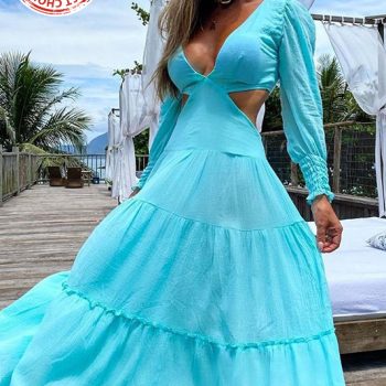 Fleepmart Sexy V-Neck Solid Backless Hollow Out Dress 2021 Summer Women Long Sleeve Club Party Long Maxi Dresses Vestidos De Festa