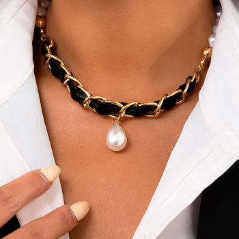victoria’s vogue Vintage Imitation Pearl Baroque Pendant Necklaces for Women Punk Cross PU Leather Choker Necklaces Jewelry Collier