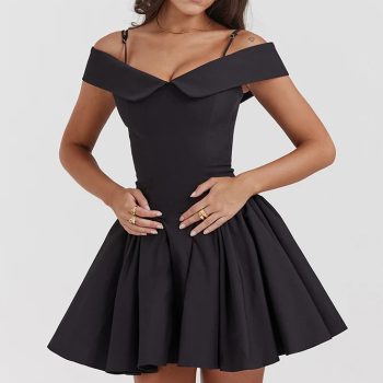 Victoria’s vouge Off-shoulder Spaghetti Strap Sexy Mini Dress For Women Fashion Black Sleeveless Backless Pleated Club Party Dress