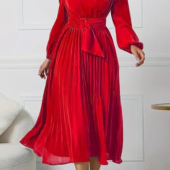 Victoria’s Vogue Plus Size Elegant Bridesmaid Dress, Women’s Plus Solid Lantern Sleeve Surplice Neck Pleated Evening Formal Dress With Belt
