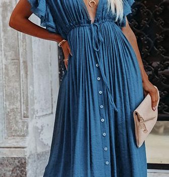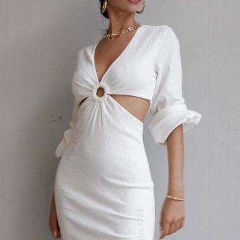 Victoria’s Vogue Sexy Deep V-neck Butterfly Sleeve Self Belted High Waist Button Front Open Summer Beach Dress WhiteTunic Women Beachwear