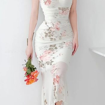 Victoria’s Vogue Floral Slip Midi Dress Women Sleeveless Backless Sexy Bodycon High Split Chic Beachwear Pure Desire Spaghetti Stapdress