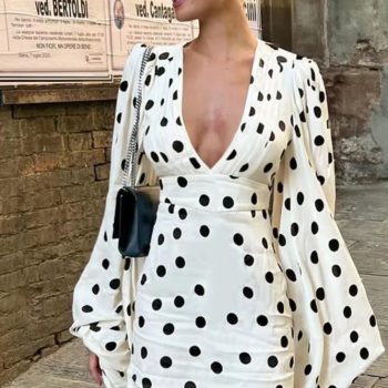 Victoria’s Vogue Polka Dot Flare Long Sleeve Sexy Mini Dress Women Autumn Winter Deep V Neck High Waist Ruched Club Party Dresses Female