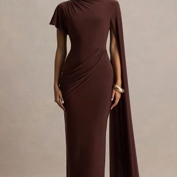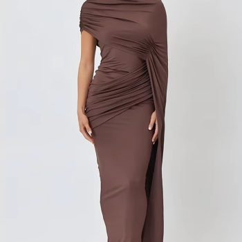 Victoria’s Vogue One Long Cape Sleeve Sexy Maxi Dress Women Gown Elegant O Neck Half High Collar High Waist Ruched Club Party Long Dress