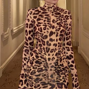 Victoria’s Vogue Turtleneck Long Sleeve Sexy Mini Dress Women Elegant Leopard Print Backless High Waist Bodycon Club Party Dresses